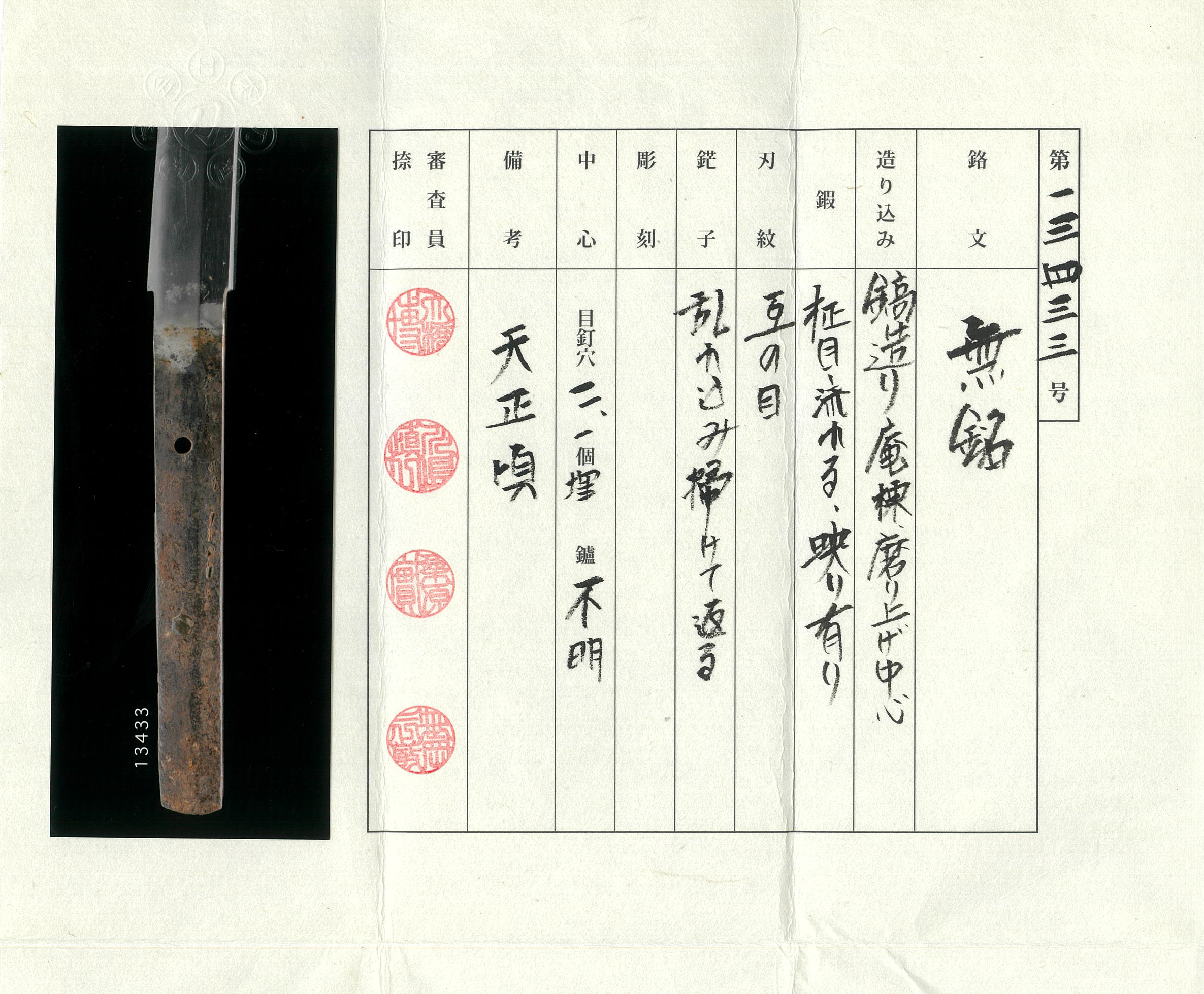 This blade is attributed to Nōshū Kanemoto (濃州兼元), dating it to the Tenbun era (1532–1555) of the late Muromachi period. Although the blade bears no remaining signature, the attribution is based on its characteristics. “Nōshū” is another name for Mino Province, where this blade was forged.