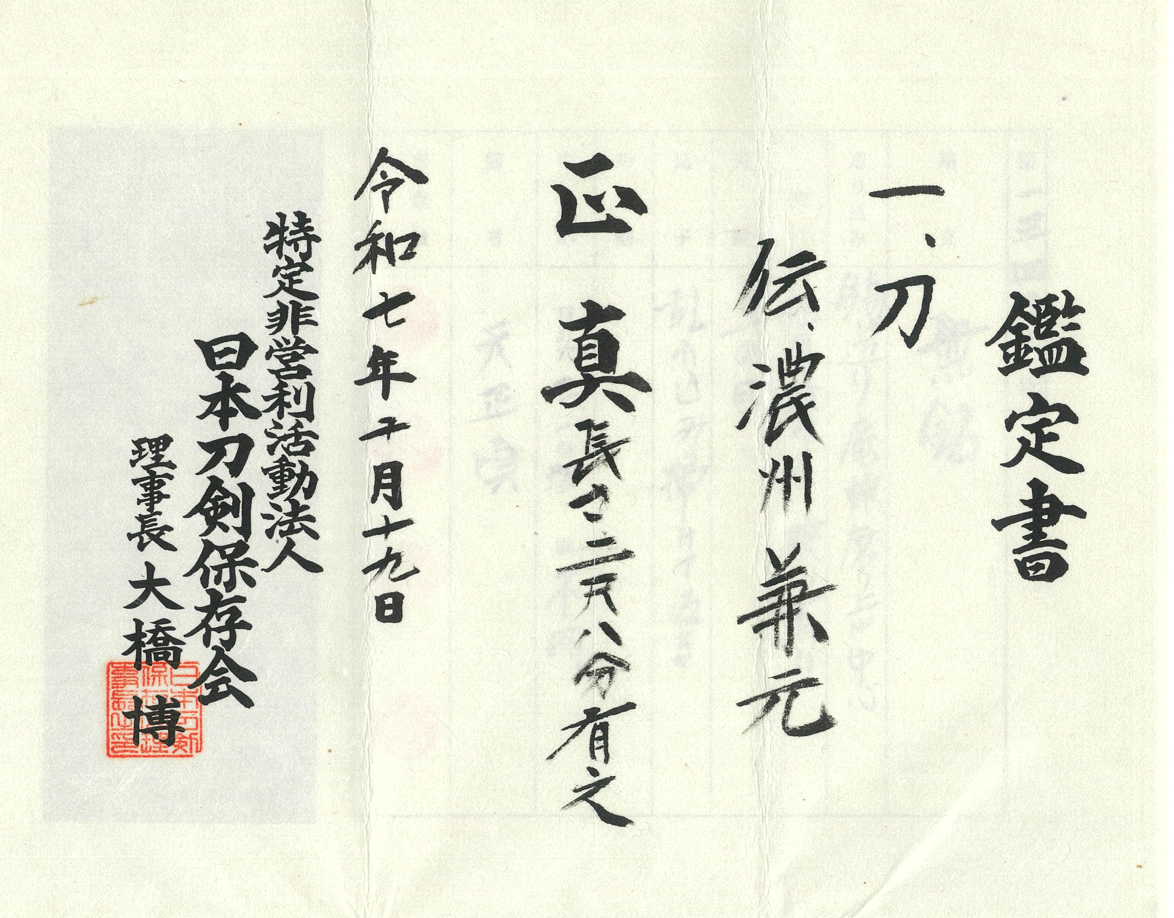 This blade is attributed to Nōshū Kanemoto (濃州兼元), dating it to the Tenbun era (1532–1555) of the late Muromachi period. Although the blade bears no remaining signature, the attribution is based on its characteristics. “Nōshū” is another name for Mino Province, where this blade was forged.