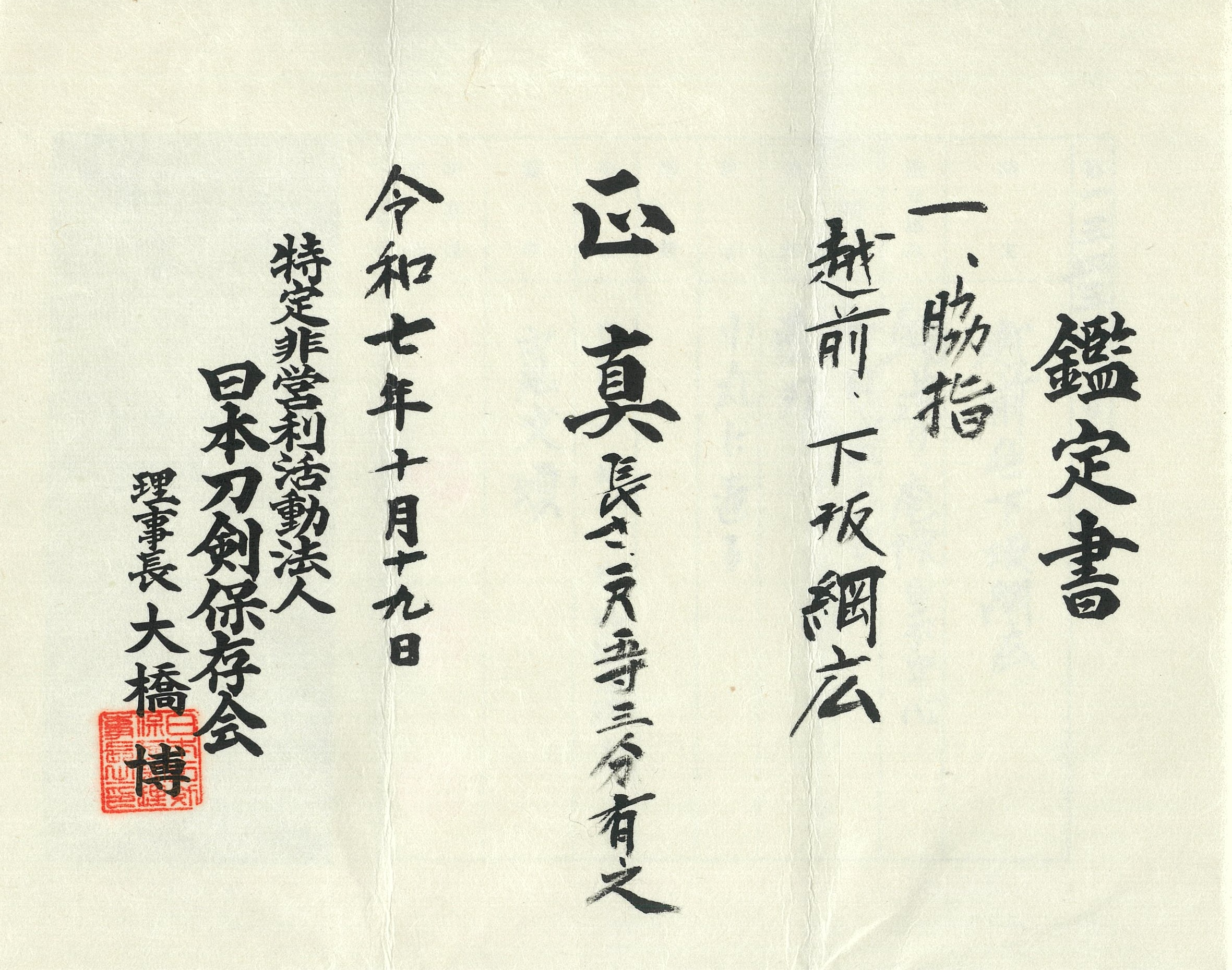 NTHK, also known as NPO Nihon Touken Hozon Kai, is the oldest organization for sword authentication of Japanese swords in modern times. It was established in 1910 during the post-Samurai era. Both Katana and Wakizashi were authenticated by NTHK on October 19th in 2025. The purchaser will receive these original certificates as well. We can also translate what is written into English and make a PDF file for your record if you request.