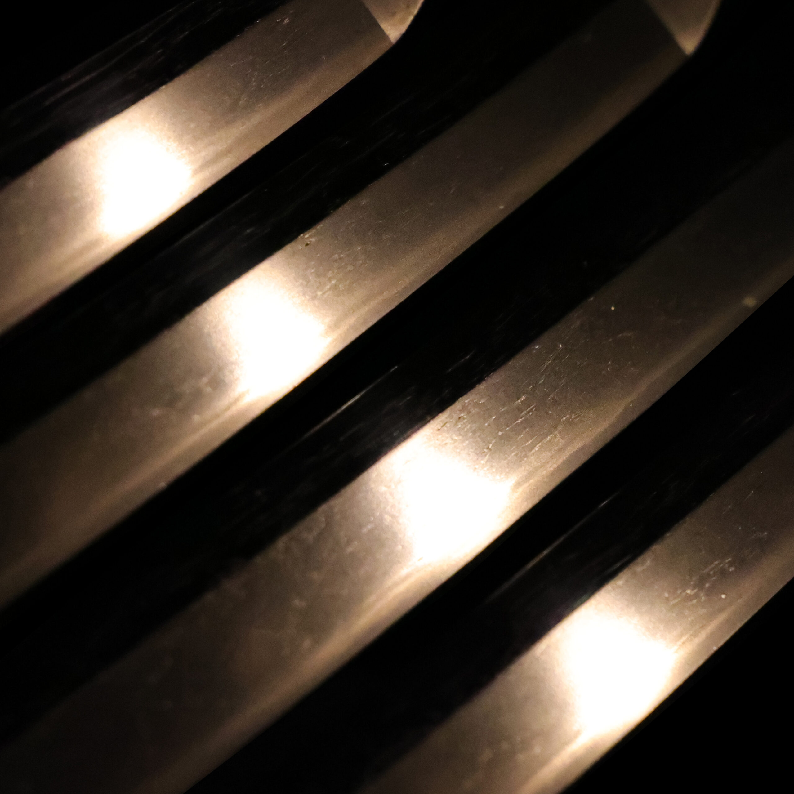 The origin of the name Naminohira dates back to the school’s foundation. It is said that the founder, Masakuni, was able to calm the waves by dedicating his sword to the sea when his school from Yamato sailed to live in the Satsuma domain. Since then, he began to use the title “Naminohira Yukiyasu (波平行安)” – “Tides are quiet, ’tis an easy way.” From the late Heian period until the end of Samurai times (Late 19th century), the Naminohira school maintained mastership for a thousand years. Ko Naminohira refers to works from the late Kamakura to the early Nanbokucho period (Early 14th century) of the Naminohira school. The swords forged in the YAMATO-DEN tradition are famous for their beautiful Jigane, steel surface, and straight tempering line (Suguha).
