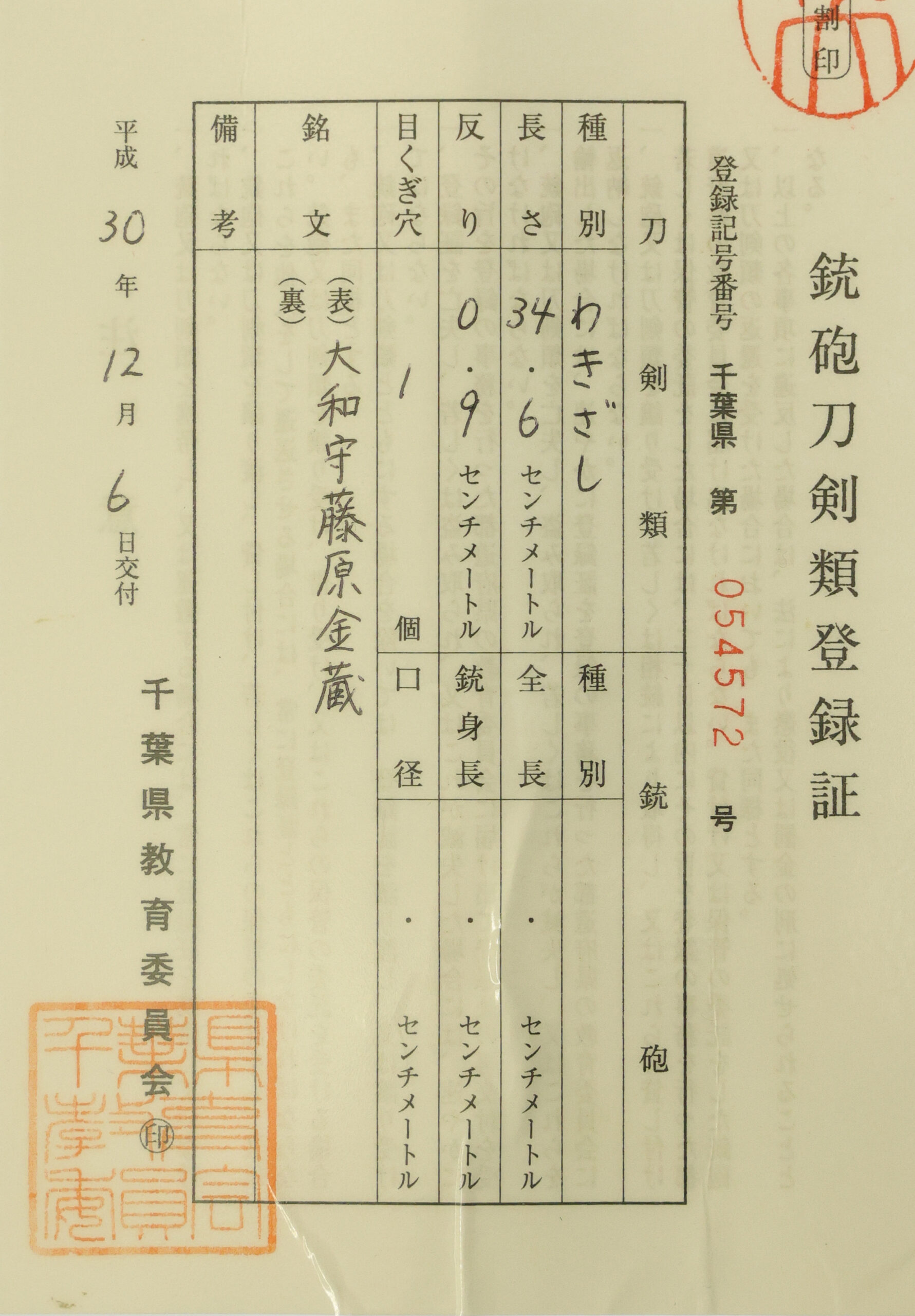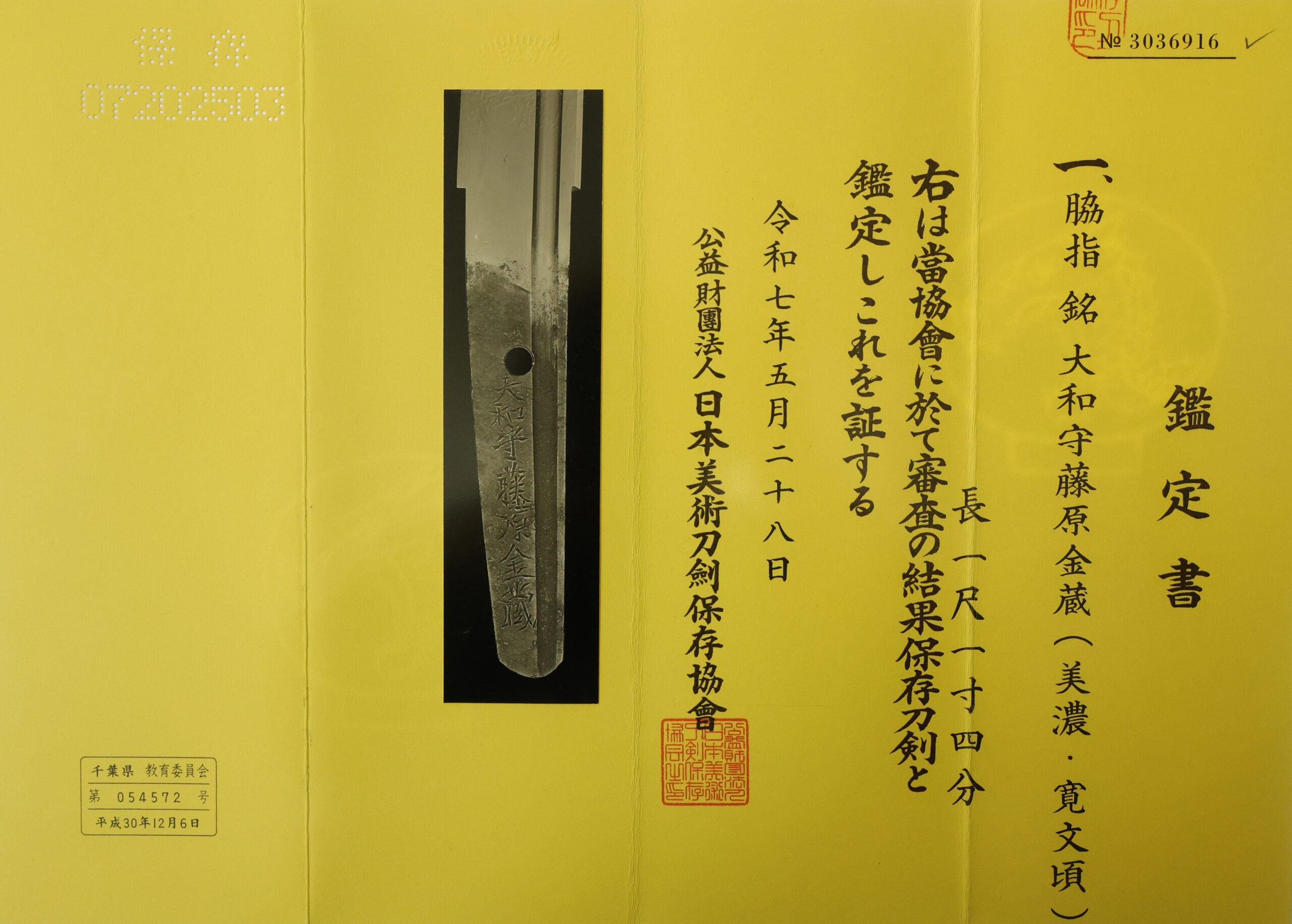 The Board of Education in Tokyo and Chiba prefecture issued a registration paper for this Katana blade and Wakizashi blade. It is called Jyu Hou Token Rui Torokusho (銃砲刀剣類登録証). Bunkacho (The Agency for Cultural Affairs) acknowledges a Japanese sword with this paper as a work of art.