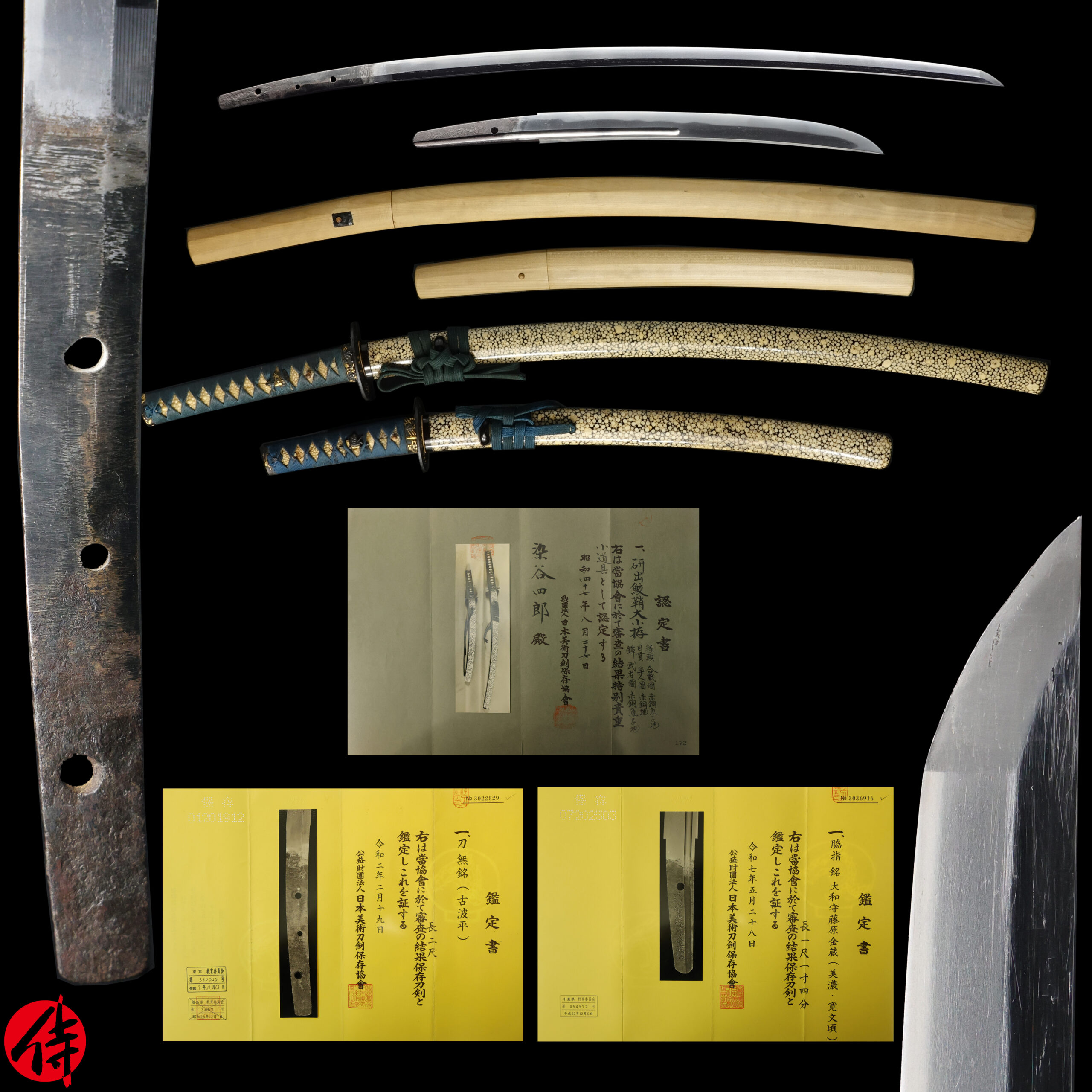 Antique Japanese Sword Daisho Attributed to Ko Namihira / Signed by Yamato no Kami Fujiwara Kanekura with NBTHK Hozon Certificate and NTHK Kanteisho Certificate for the Koshirae