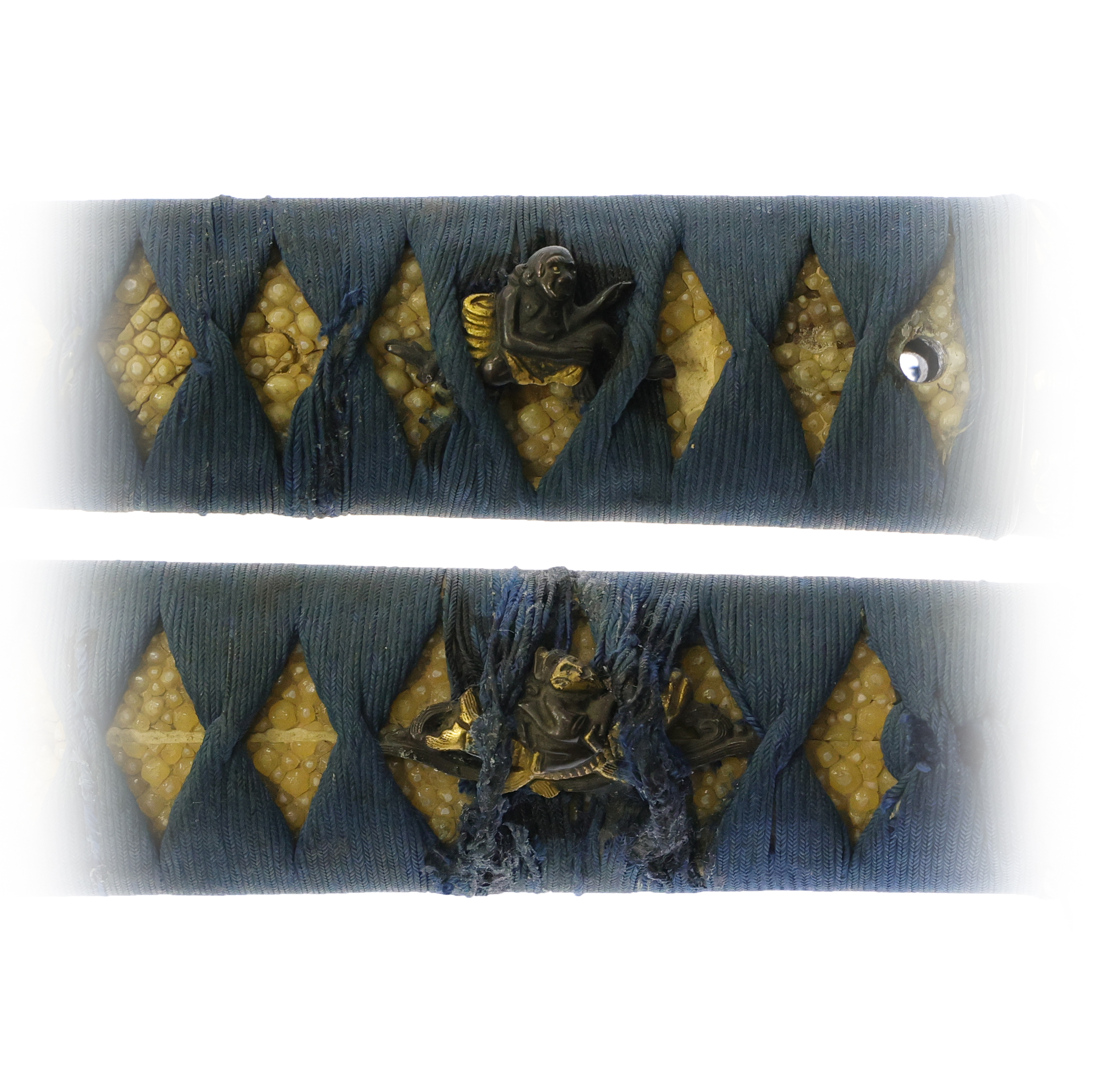 The Tsuba of the wakizashi features Raijin (雷神) and Fujin (風神). It also depicts a Samurai being swallowed by towering waves stirred up by Fujin’s winds, powerfully conveying both the intensity of the battlefield and the strong power of nature.