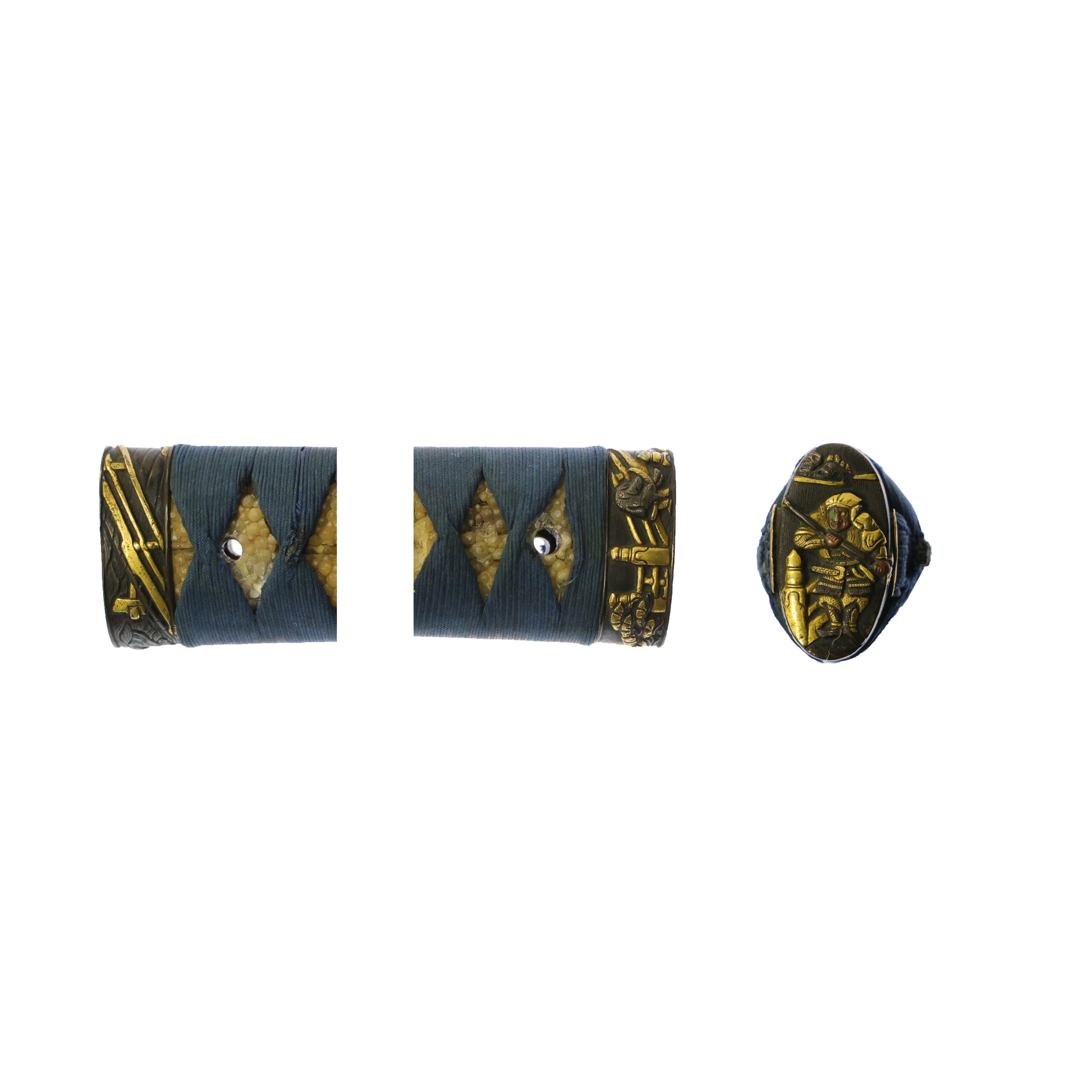 The Fuchi-Kashira of the Katana features a depiction of the Seven Lucky Gods (Shichifukujin, 七福神) and Kikusui Mon (菊水紋). THe Seven Lucky Gods is a group of deities worshipped in Japan as bringers of good fortune. The seven gods include Ebisu, Daikokuten, Bishamonten, Benzaiten, Fukurokuju, Jurōjin, and Hotei. Each god represents different forms of blessings, such as prosperity in business, bountiful harvests, wealth, success in battle, wisdom and the arts, and longevity.