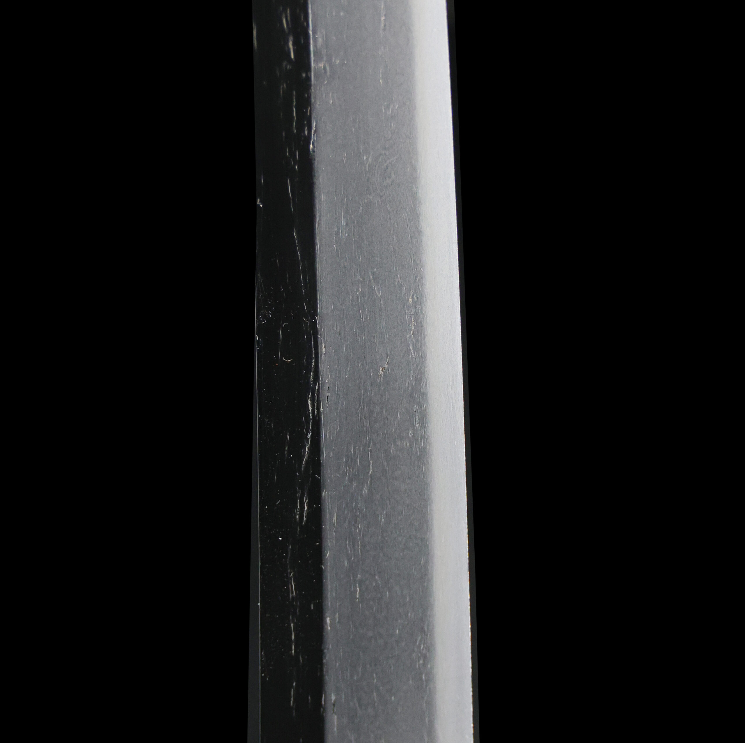Japanese swordsmiths left the black rust on the tang because it prevents red rust while the tang is in its handle. And the discoloration of the tang was created over time, and it is a great indicator for a Japanese sword specialist to estimate when the sword was forged.