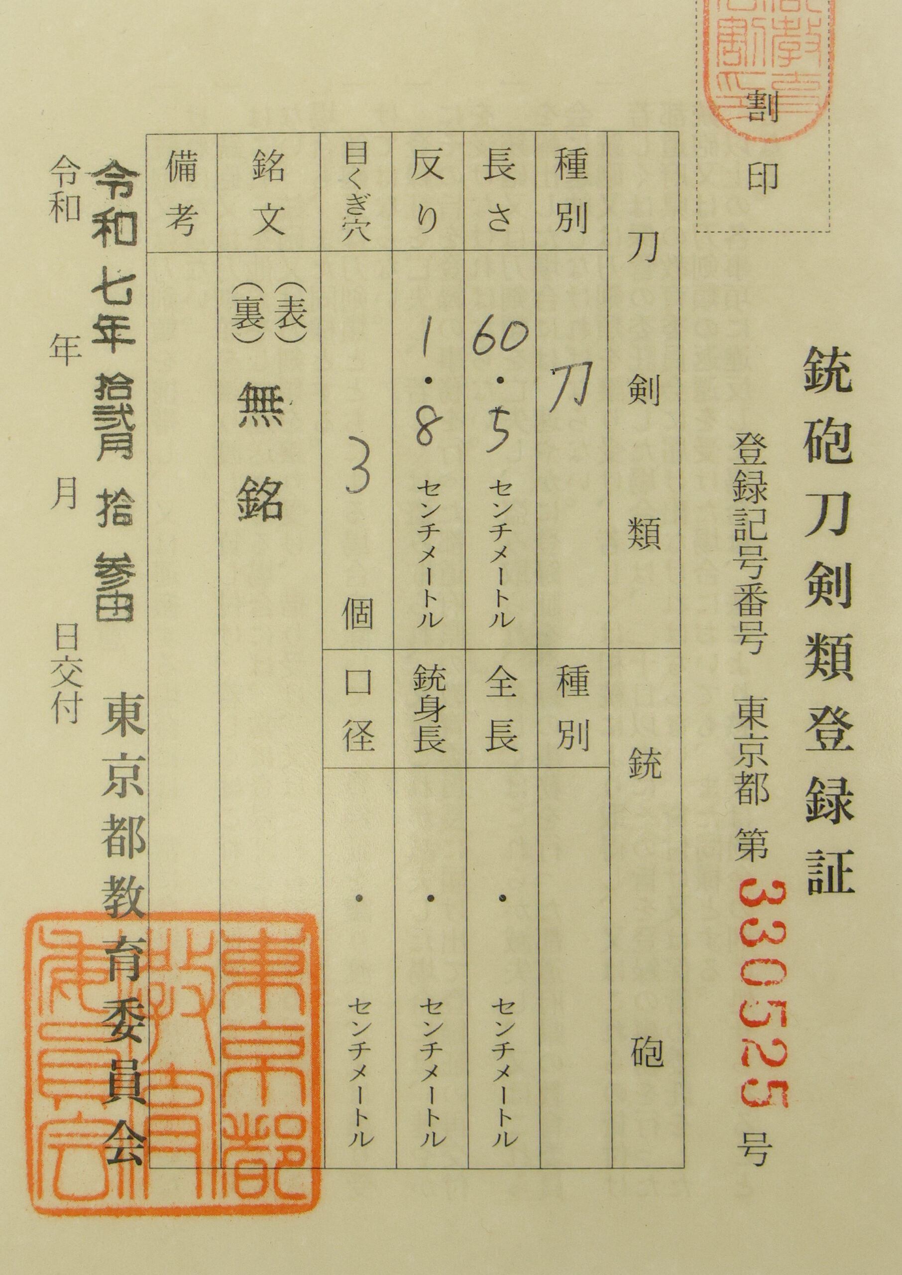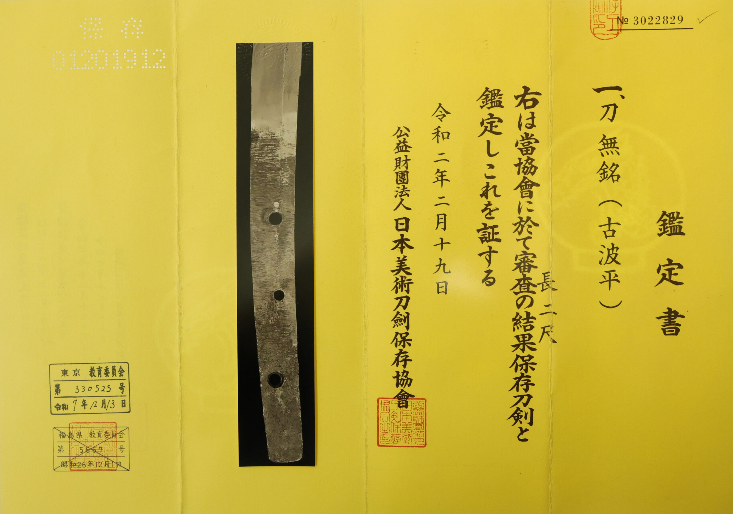 The Board of Education in Tokyo and Chiba prefecture issued a registration paper for this Katana blade and Wakizashi blade. It is called Jyu Hou Token Rui Torokusho (銃砲刀剣類登録証). Bunkacho (The Agency for Cultural Affairs) acknowledges a Japanese sword with this paper as a work of art.