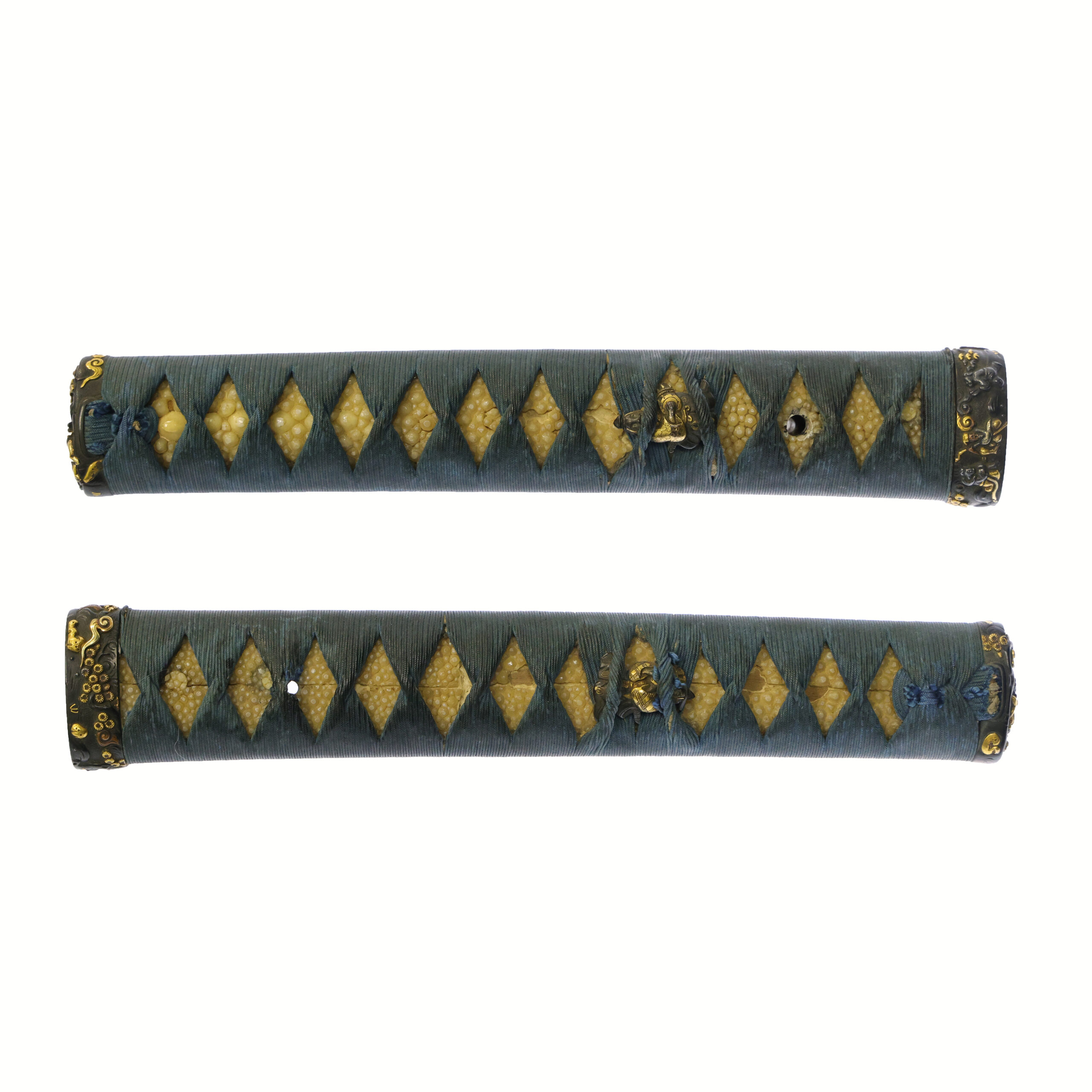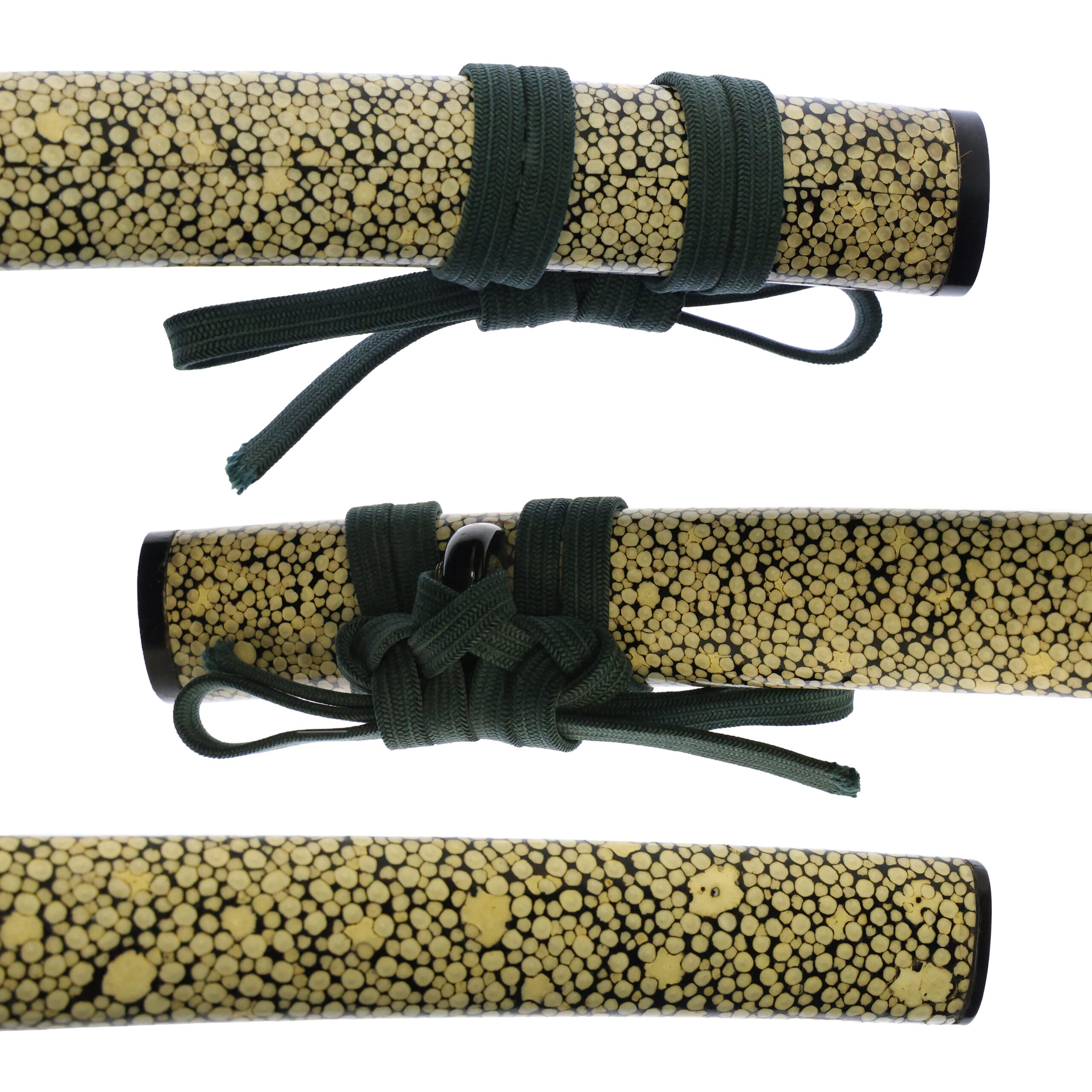 The Saya of this Katana and Wakizashi are covered in ray skin. Ray skin is not only beautiful but also has a naturally textured surface, allowing it to function as a non-slip grip.