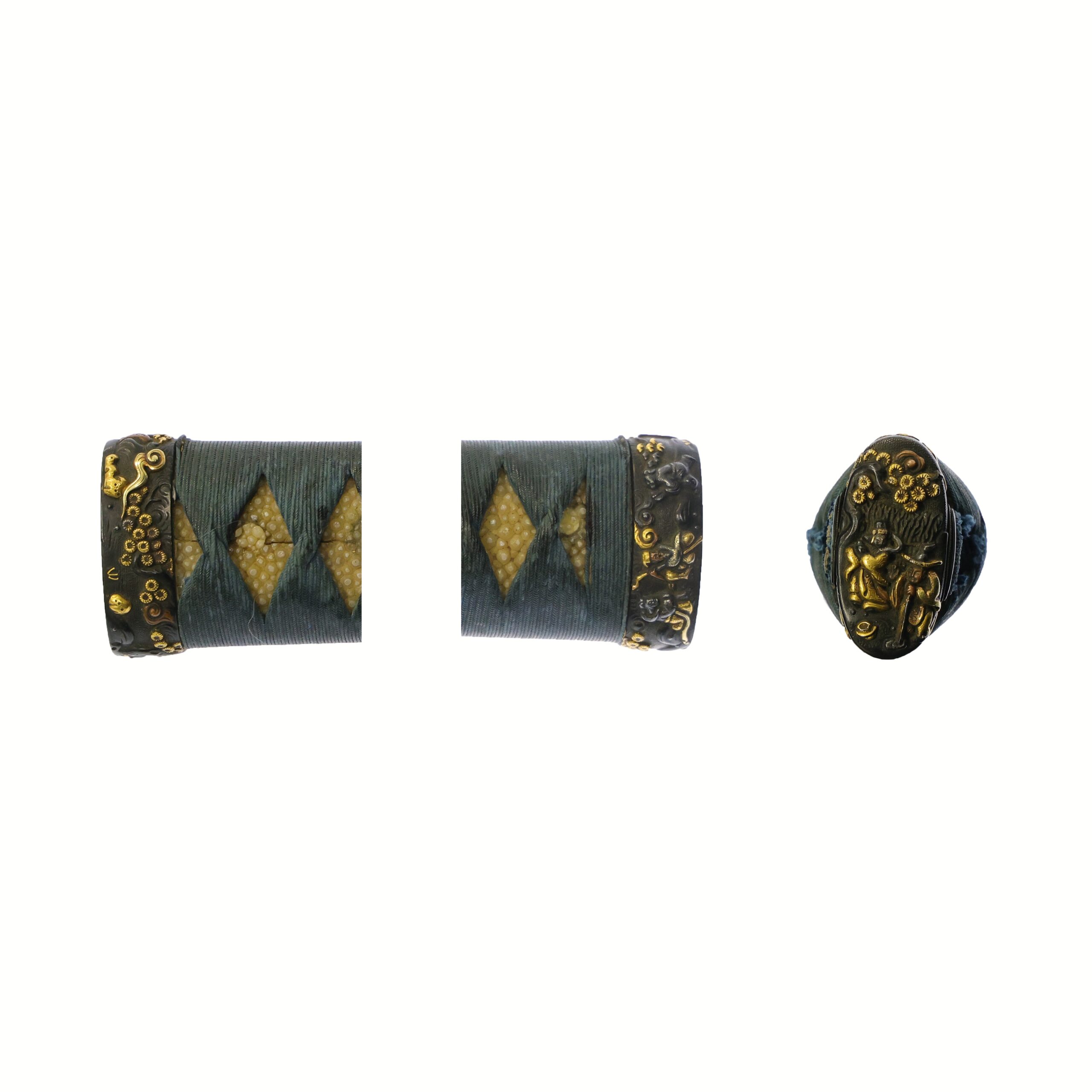 The Fuchi-Kashira of the Katana features a depiction of the Seven Lucky Gods (Shichifukujin, 七福神) and Kikusui Mon (菊水紋). THe Seven Lucky Gods is a group of deities worshipped in Japan as bringers of good fortune. The seven gods include Ebisu, Daikokuten, Bishamonten, Benzaiten, Fukurokuju, Jurōjin, and Hotei. Each god represents different forms of blessings, such as prosperity in business, bountiful harvests, wealth, success in battle, wisdom and the arts, and longevity.