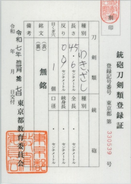 The Board of Education in Tokyo prefecture issued a registration paper for this Katana and Wakizashi on the same date. It is called Jyu Token Rui Torokusho (銃刀剣類登録証). Bunkacho (The Agency for Cultural Affairs) acknowledges a Japanese sword with this paper as a work of art.