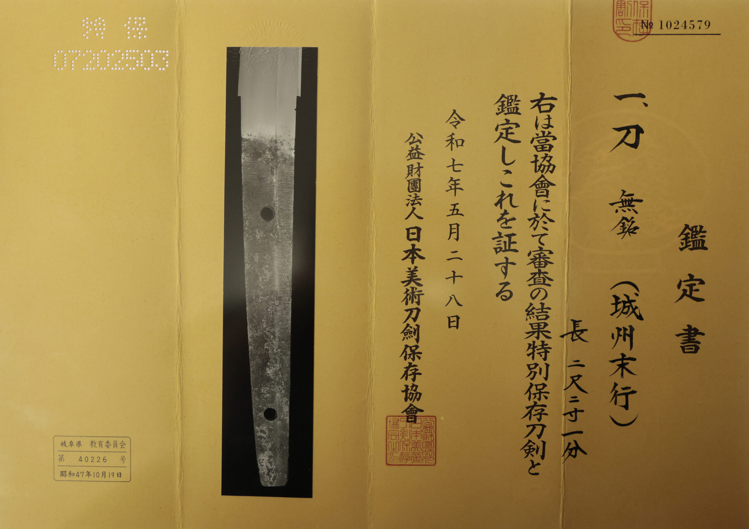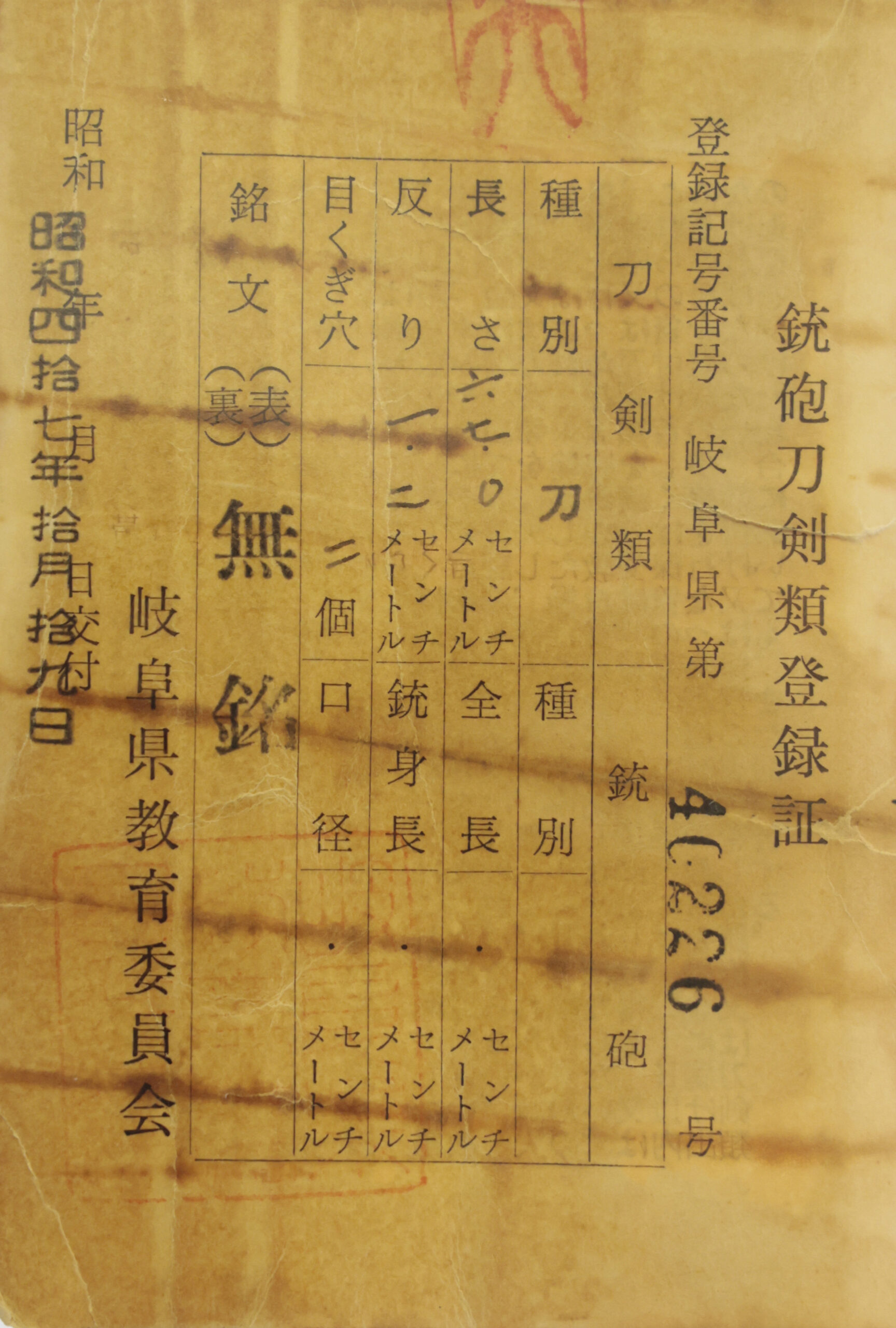 The Board of Education in Gifu prefecture issued a registration paper for this sword. It is called Jyu Token Rui Torokusho(銃刀剣類登録証). Bunkacho(The Agency for Cultural Affairs) acknowledges a Japanese sword with this paper as a work of art.