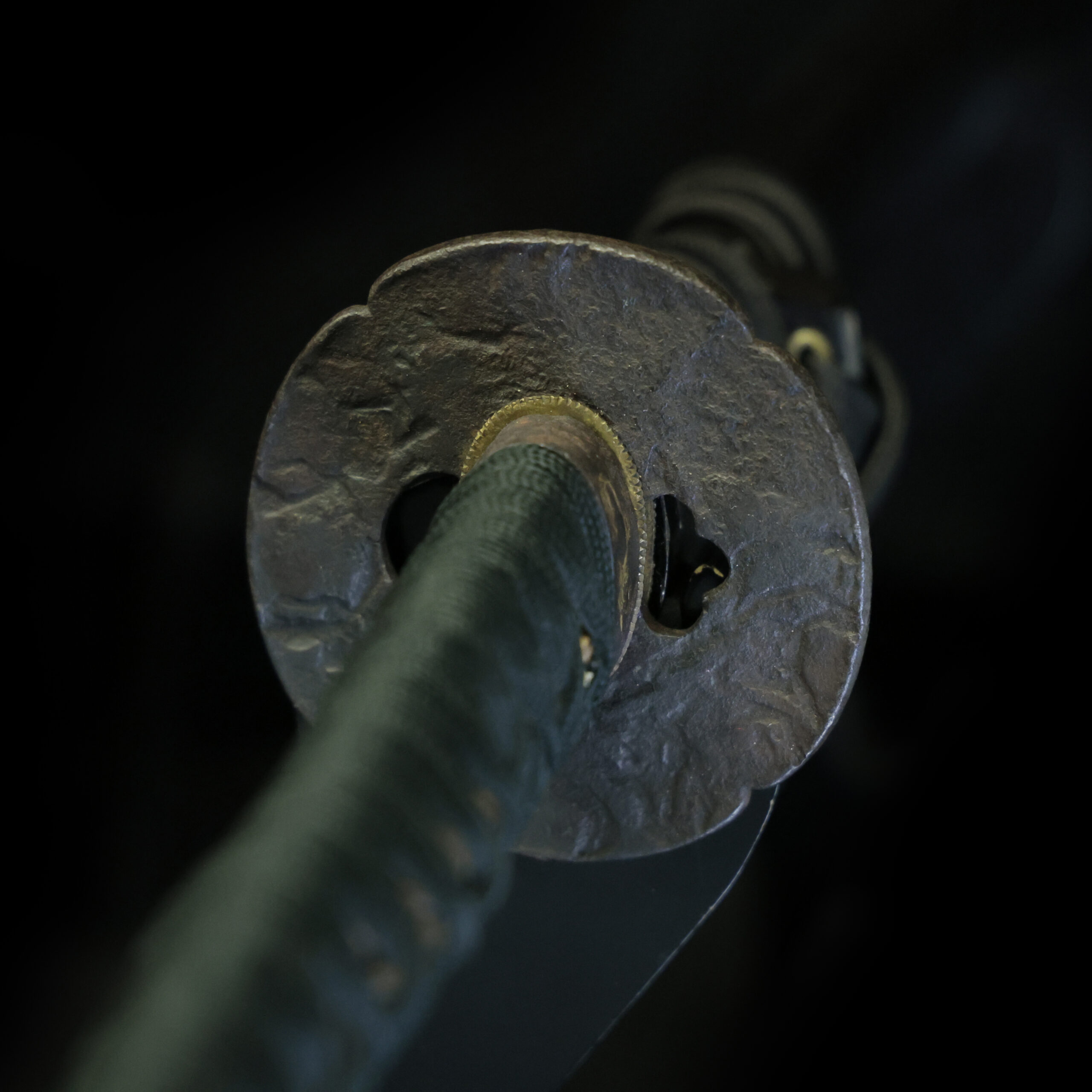 This Tsuba features Tsuschime (槌目, Hammered pattern). This pattern is created by striking the metal with a hammer, forming small indentations that reduce light reflection and give the surface a unique texture, different from the natural shine of the metal. When this technique is applied to weapons, as seen in this Tsuba, it may have also served the purpose of improving grip and making it less slippery.