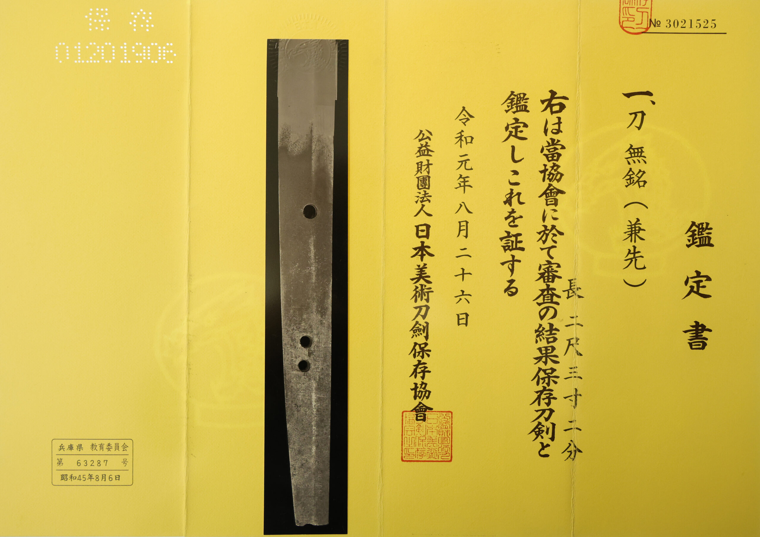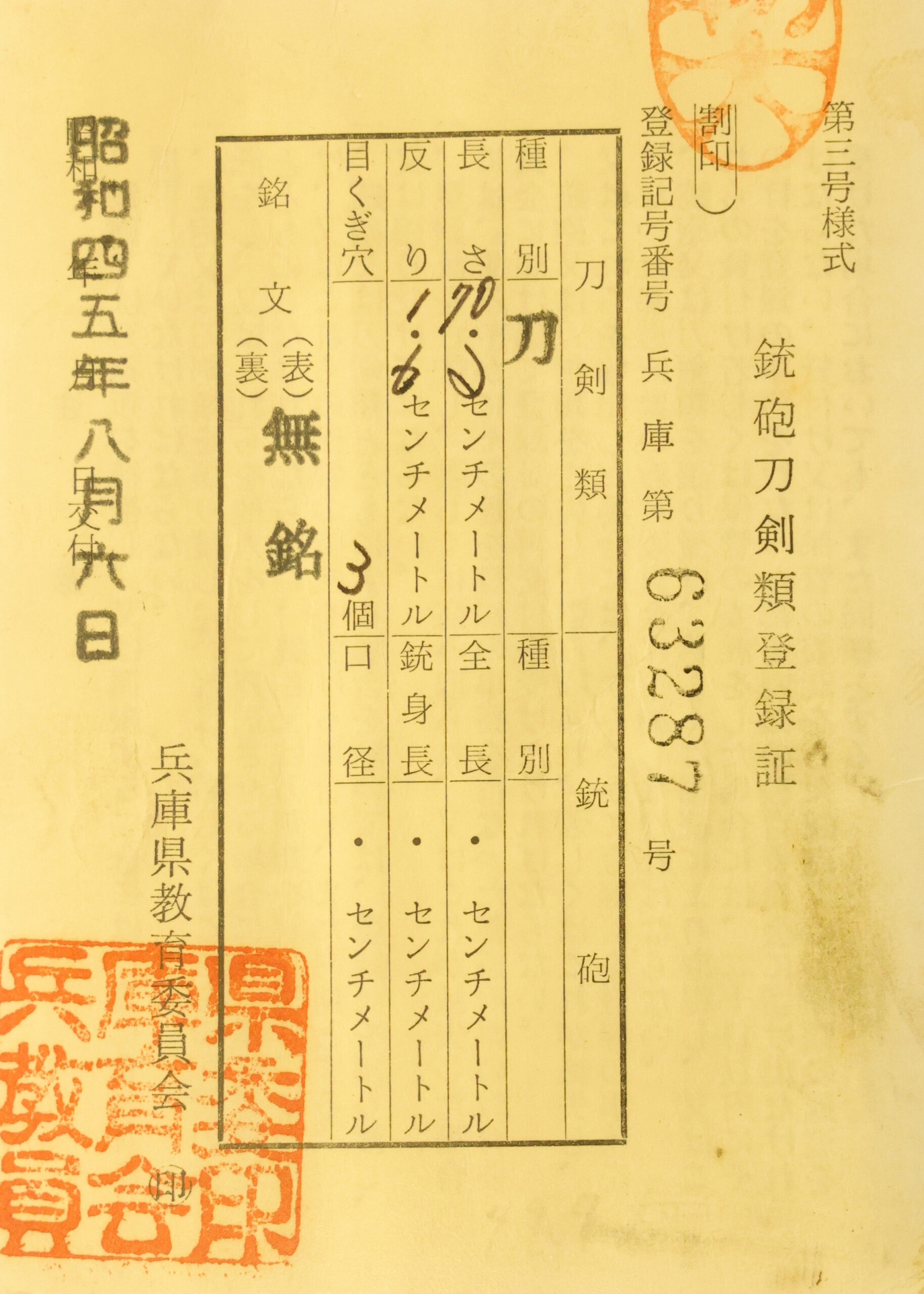 The Board of Education in Hyogo issued a registration paper for this sword. It is called Jyu Hou Token Rui Tourokusho (銃砲刀剣類登録証). Bunkacho (The Agency for Cultural Affairs) acknowledges a Japanese sword with this paper as a work of art.