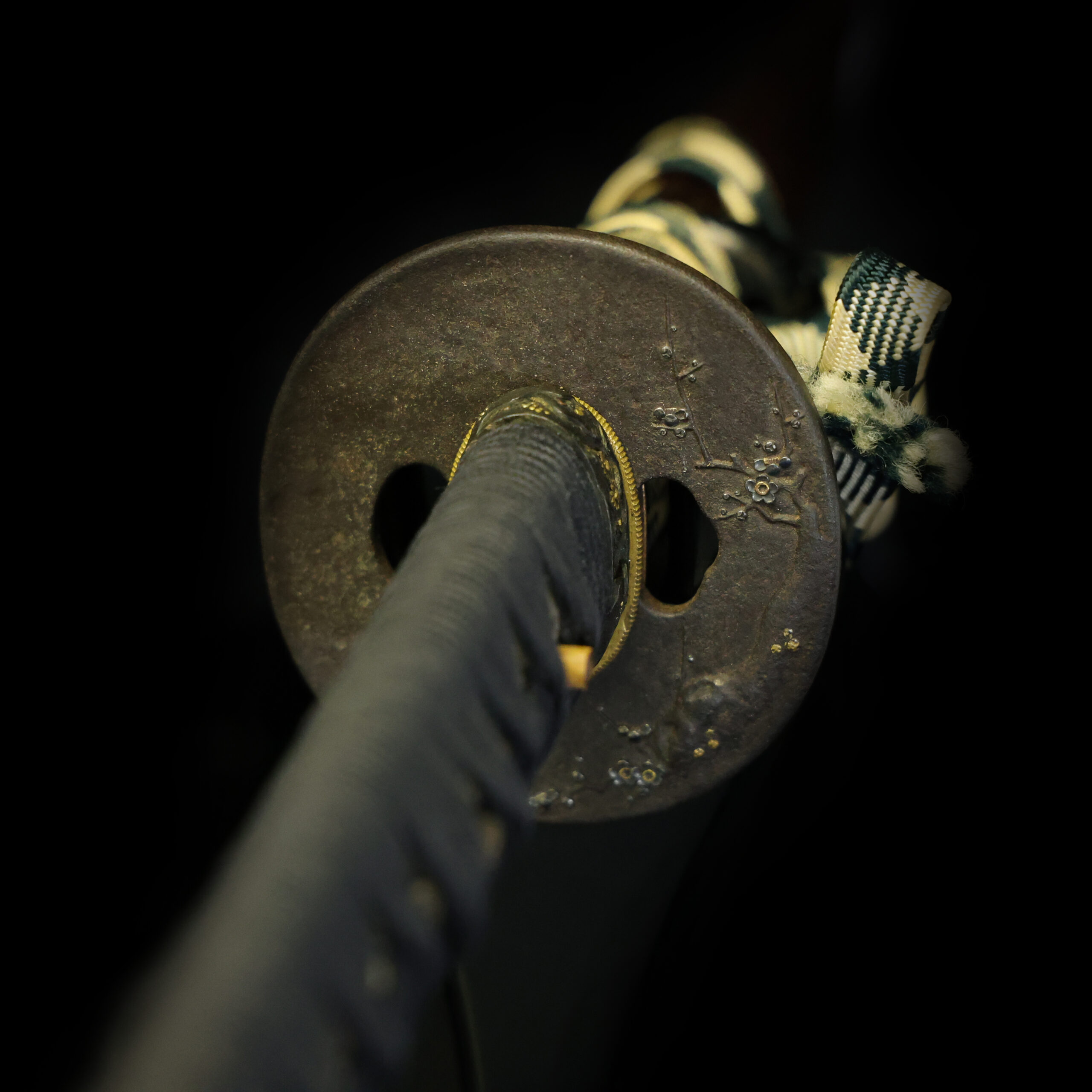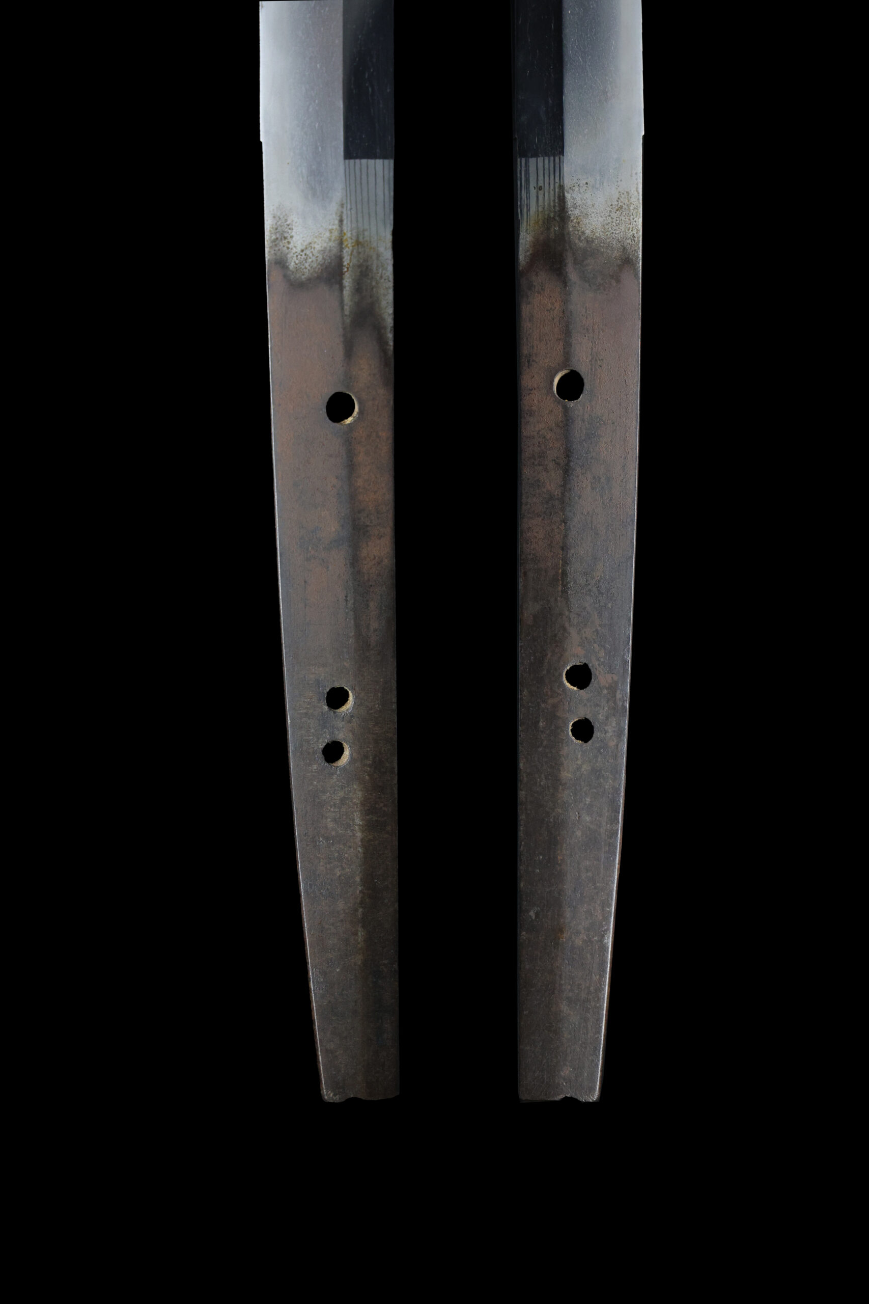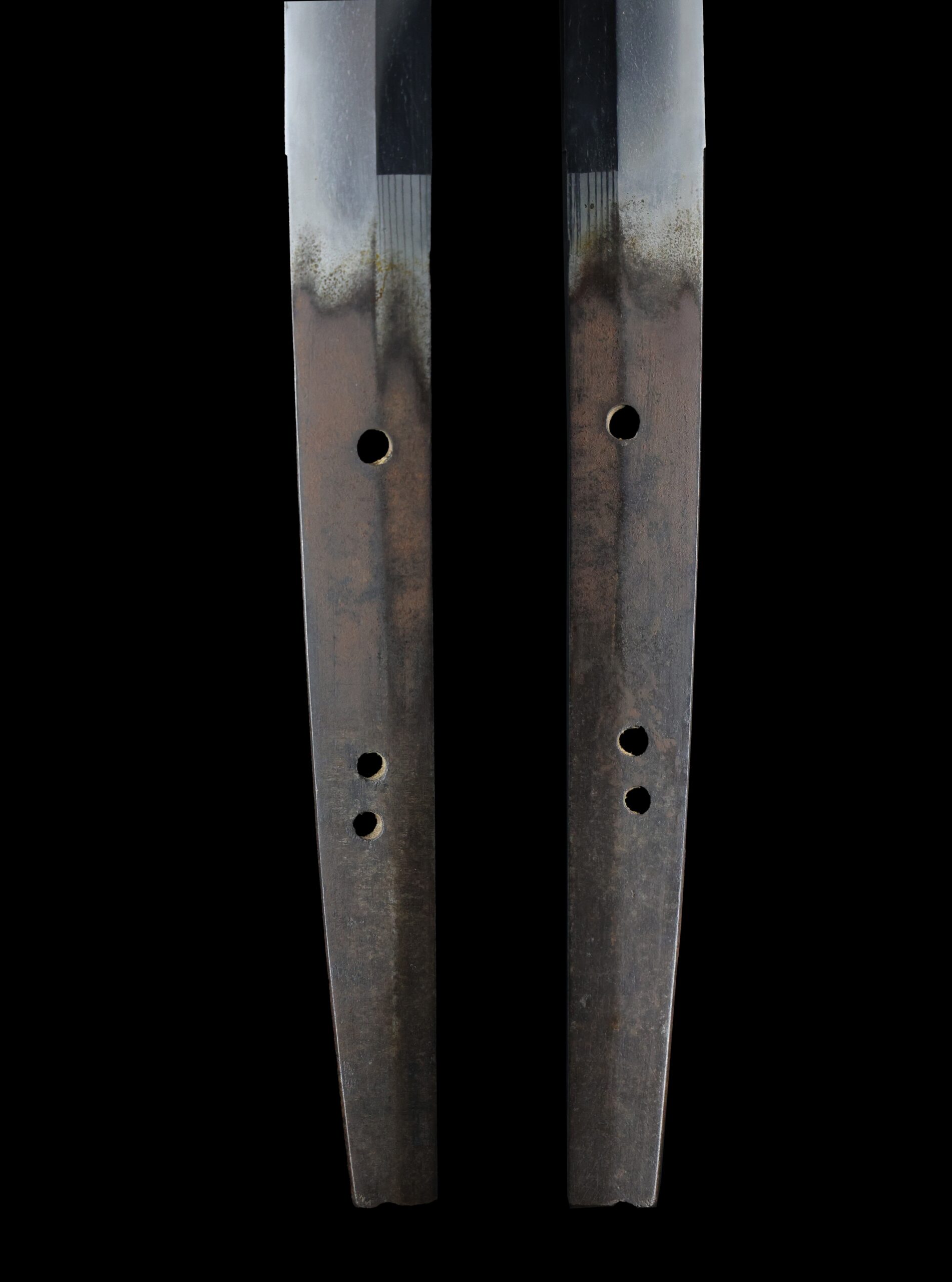 Japanese swordsmiths left the black rust on the tang because it prevents red rust while the tang is in its handle. And the discoloration of the tang was created over time, and it is a great indicator for a Japanese sword specialist to estimate when the sword was forged.