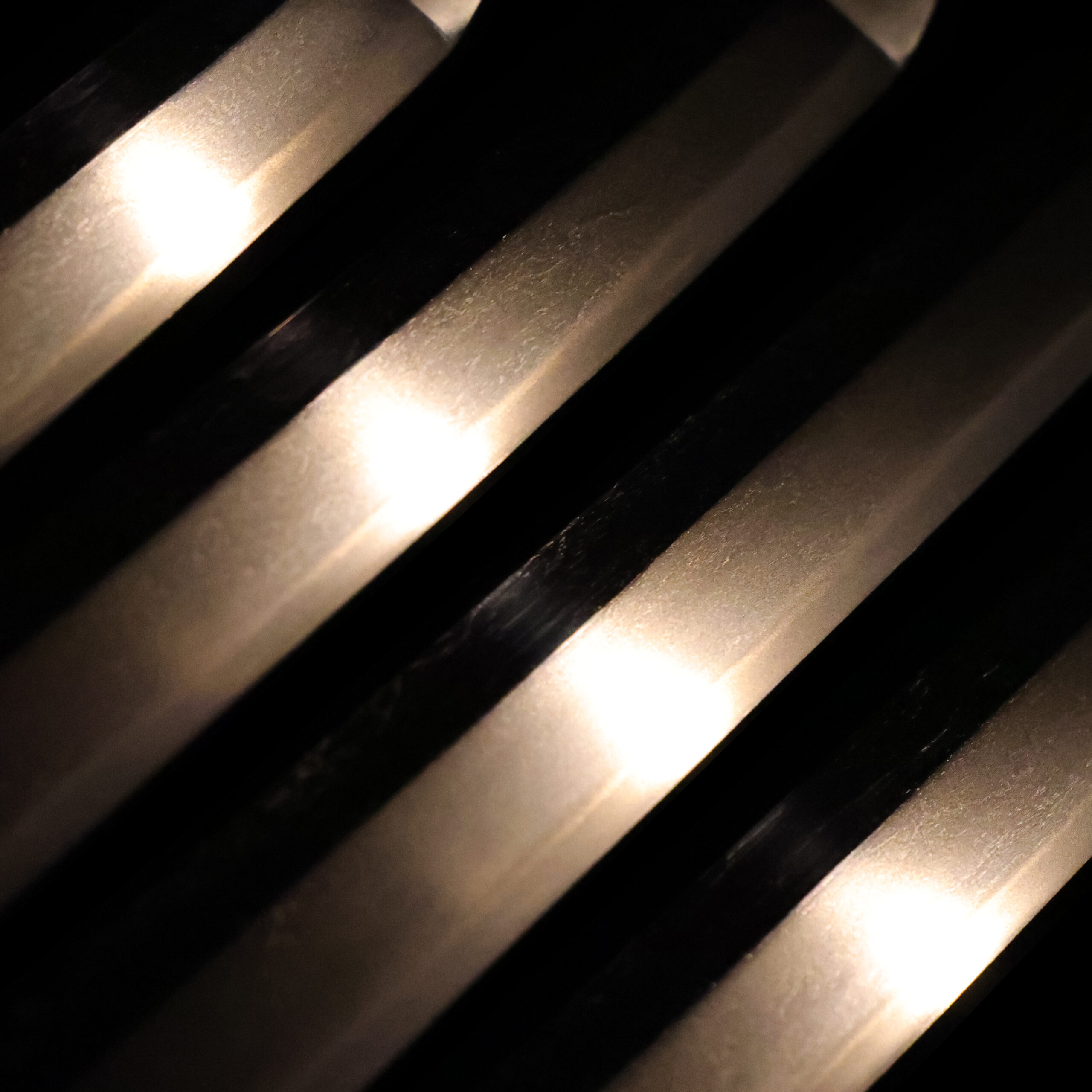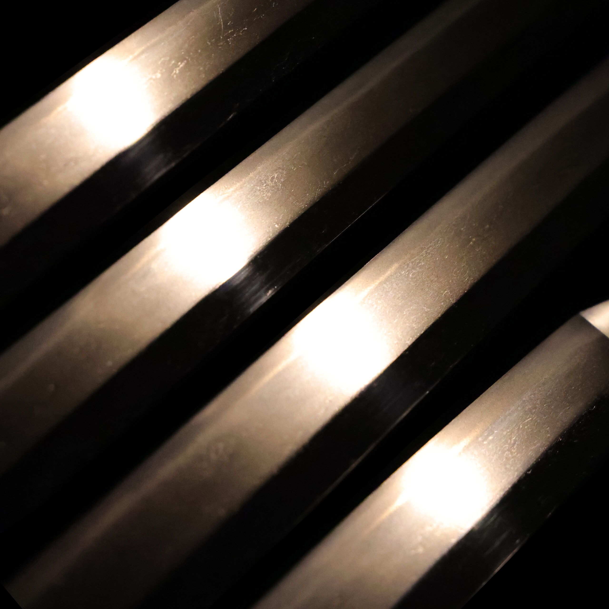 This Saya is covered with black lacquer. Due to its high waterproof effect, lacquer has been used since ancient times in Asia. The blade of a Japanese sword is made of iron, and moisture is the greatest enemy of iron. For the purpose of carrying the blade without degrading it, people devised a method of coating the scabbard with lacquer. To prevent not only moisture but also rain and snow from penetrating the inside of the scabbard, it was necessary to apply multiple layers of lacquer. The Nushi (塗師, lacquerers) was born precisely because advanced techniques were required to handle the complicated processes.