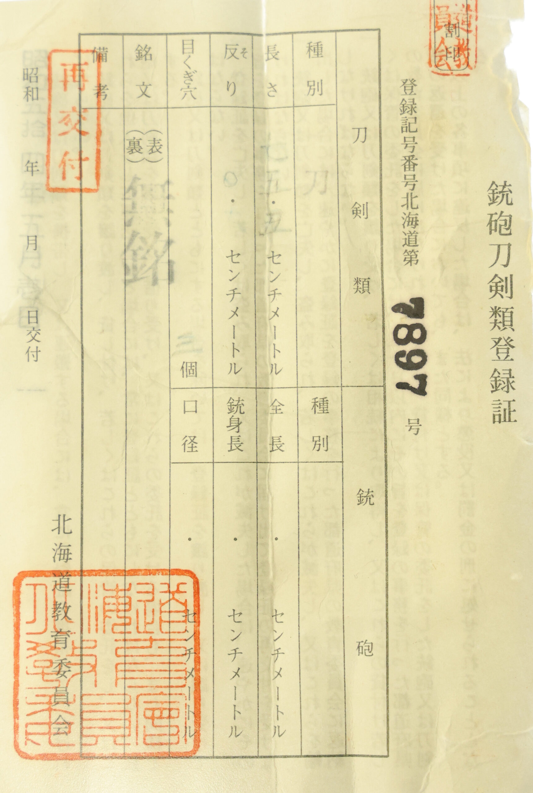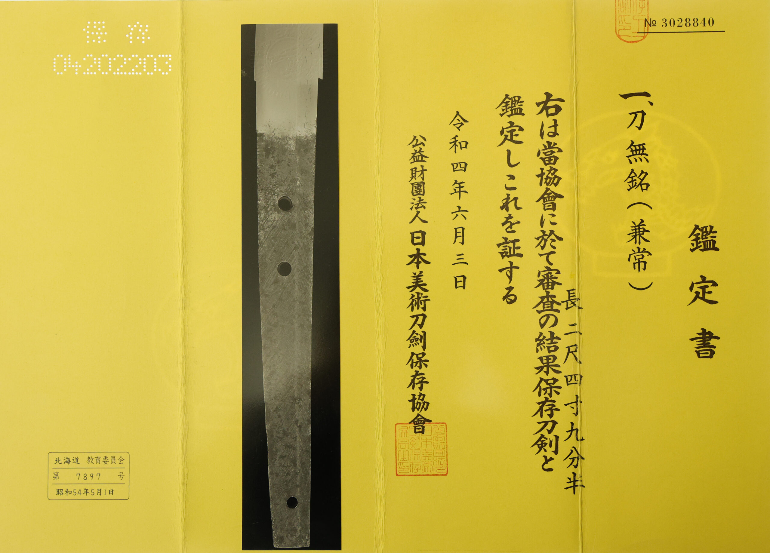 The Board of Education in Hokkaido issued a registration paper for this sword. It is called Jyu Hou Token Rui Tourokusho (銃砲刀剣類登録証). Bunkacho (The Agency for Cultural Affairs) acknowledges a Japanese sword with this paper as a work of art.
