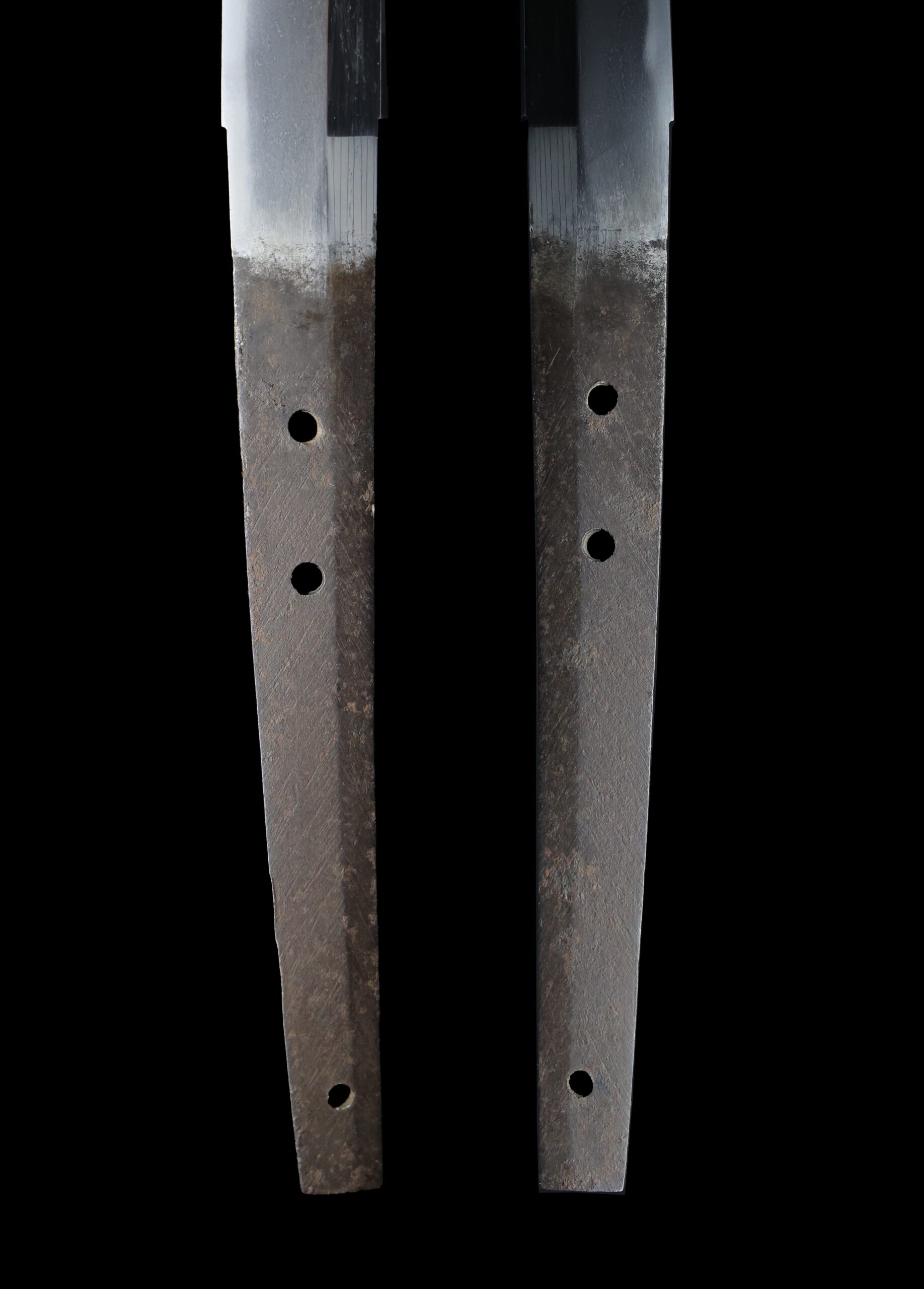 Japanese swordsmiths left the black rust on the tang because it prevents red rust while the tang is in its handle. And the discoloration of the tang was created over time, and it is a great indicator for a Japanese sword specialist to estimate when the sword was forged.