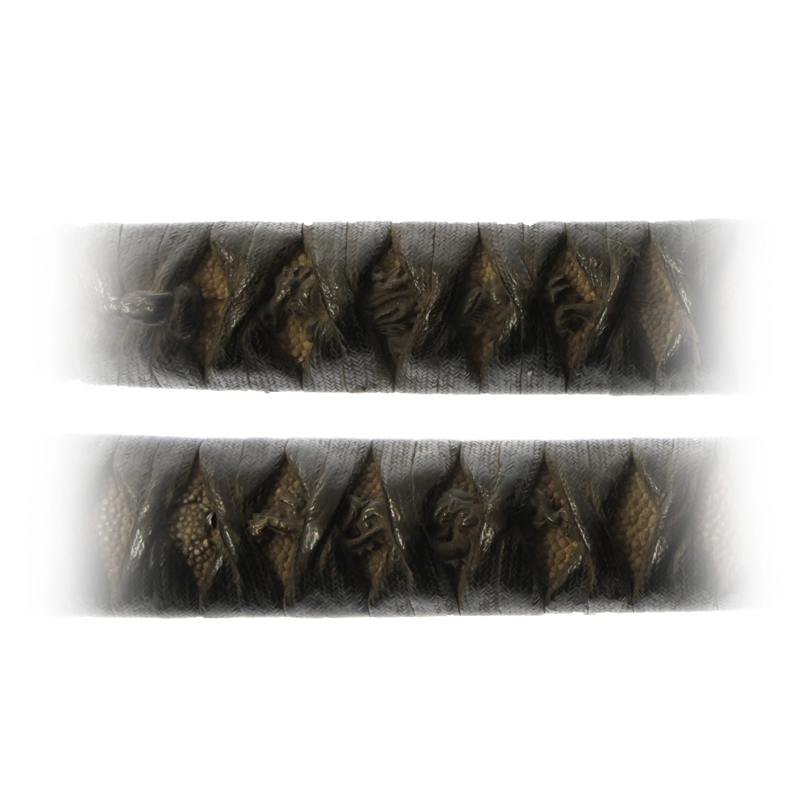 We estimate the motif of this menuki is a dragon. Initially, the dragon is an imaginary creature found in ancient Chinese traditions or myths. Furthermore, it is regarded as a symbolic beast of auspicious signs. Its body is likened to nine animals: antlers are deer, the head is a camel, eyes are demons, the neck is a snake, belly is Mizuchi (蛟, mythical animal in Japan which looks like a snake and have a horn and four legs), scales are fish, claws are falcons, palms are tigers, and ears are cows. It was thought that the dragon would reign at the top of all animals because of its odd-looking appearance.