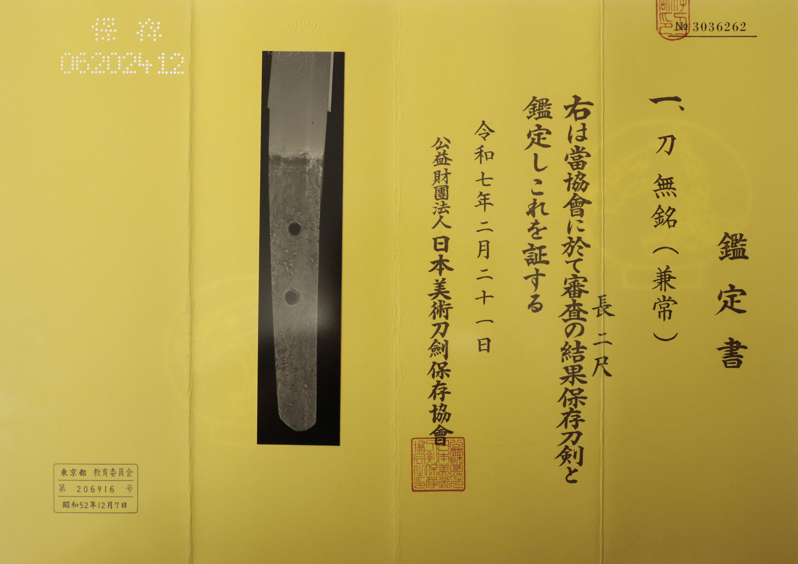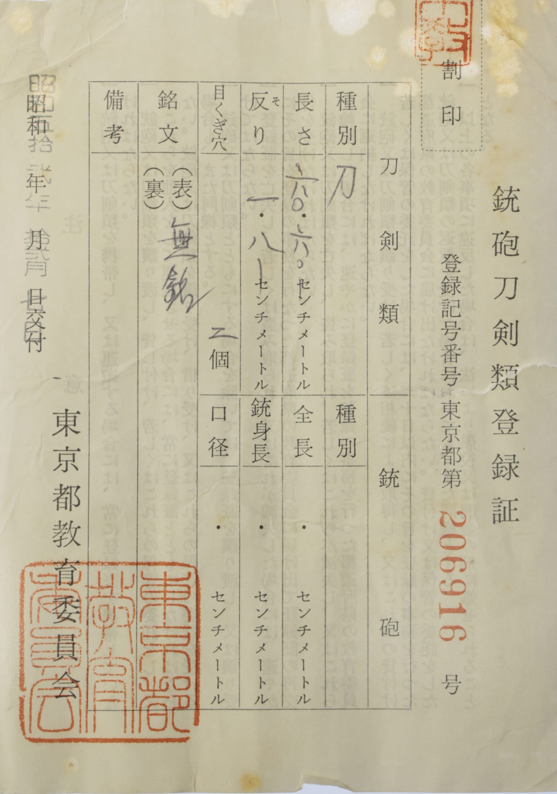 The Board of Education in Tokyo issued a registration paper for this sword. It is called Jyu Hou Token Rui Torokusho (銃砲刀剣類登録証). Bunkacho (The Agency for Cultural Affairs) acknowledges a Japanese sword with this paper as a work of art.