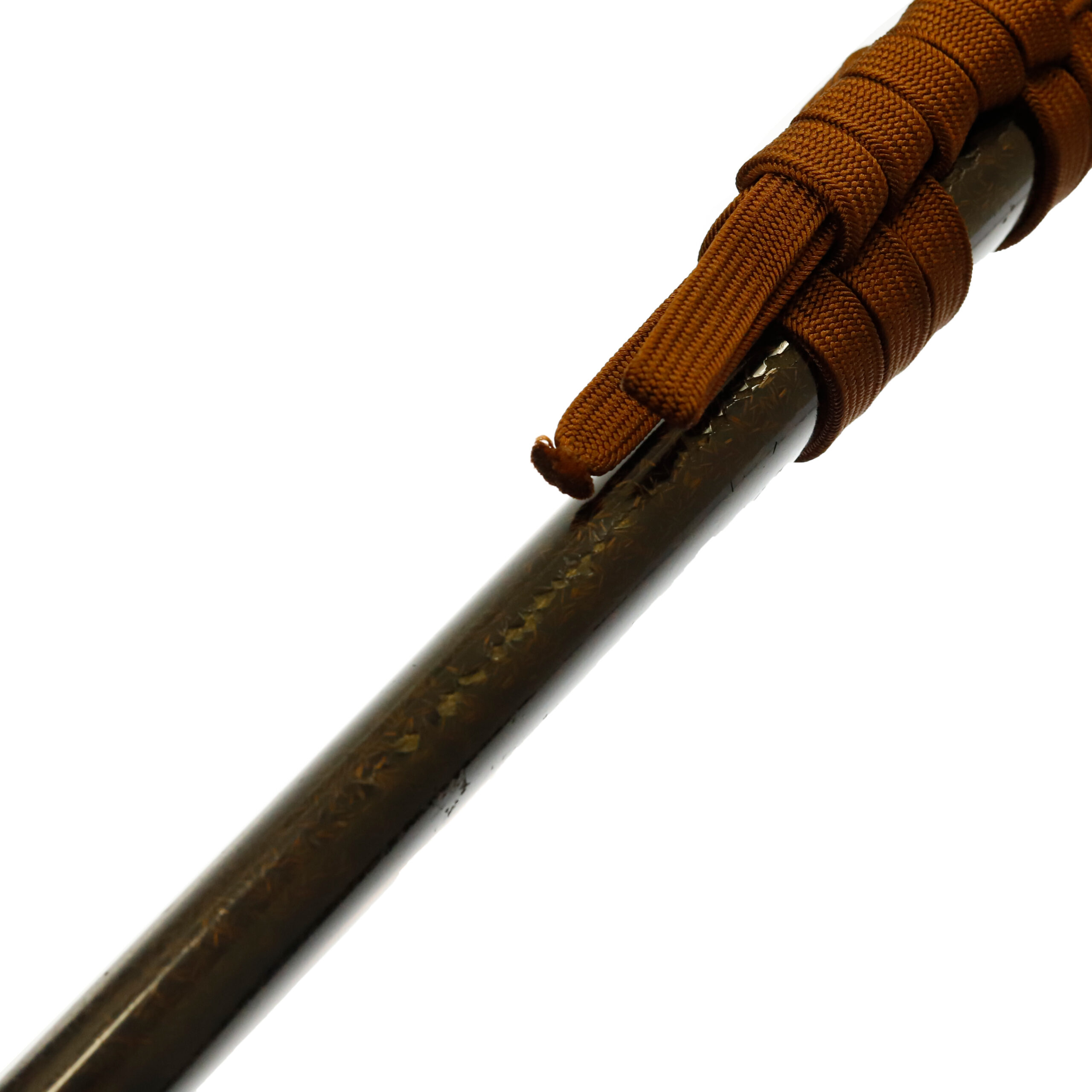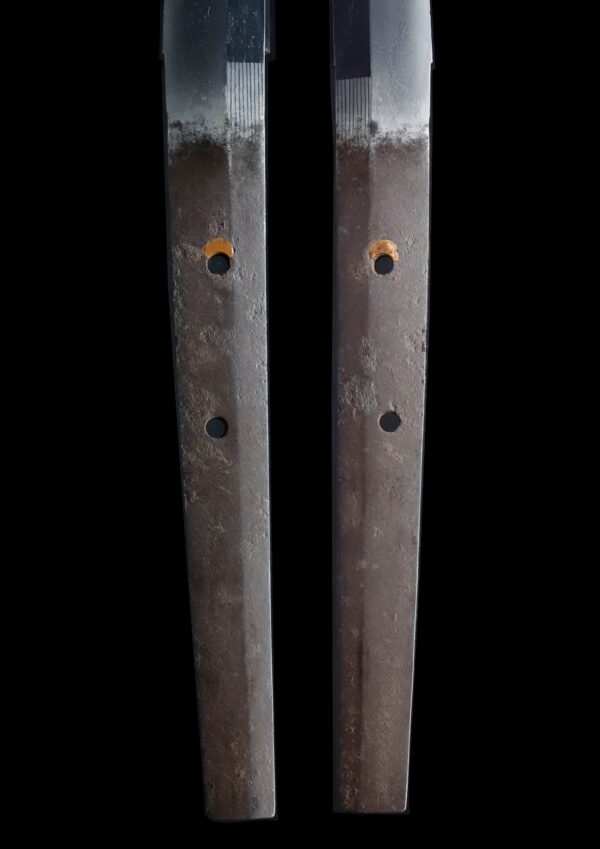 Japanese swordsmiths left the black rust on the tang because it prevents red rust while the tang is in its handle. And the discoloration of the tang was created over time, and it is a great indicator for a Japanese sword specialist to estimate when the sword was forged.