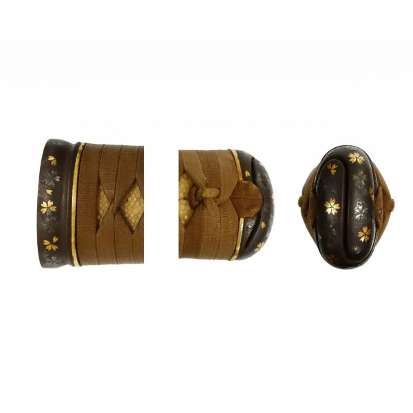 The cherry blossom pattern is designed for this Fuchi Kashira. Golden paint is applied to these flowers and makes an ornamental look of this work. Some coloring has faded due to aging; however, this Fuchi Kashira still keeps its decorativeness. Cherry blossom is one of the seasonal things of spring, and it has been loved for a long time in Japan. Its pattern is designed not only for sword mountings but also for Kimono (着物, traditional Japanese costume) or furnishings. Also, some Samurai families used this flower pattern for their family crests. It tells us cherry blossom has been familiar to Japanese people for a long time.