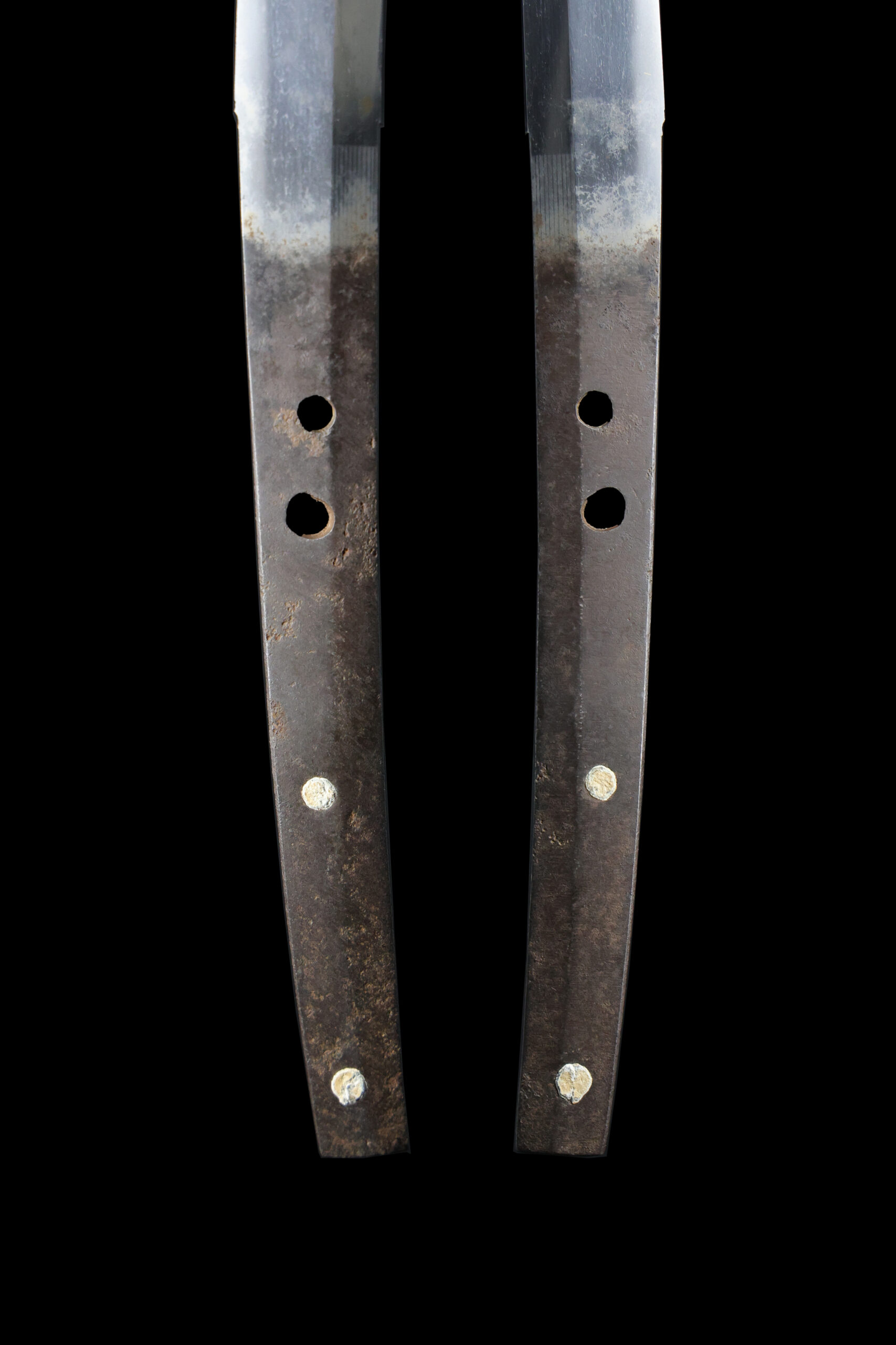 Japanese swordsmiths left the black rust on the tang because it prevents red rust while the tang is in its handle. And the discoloration of the tang was created over time, and it is a great indicator for a Japanese sword specialist to estimate when the sword was forged.