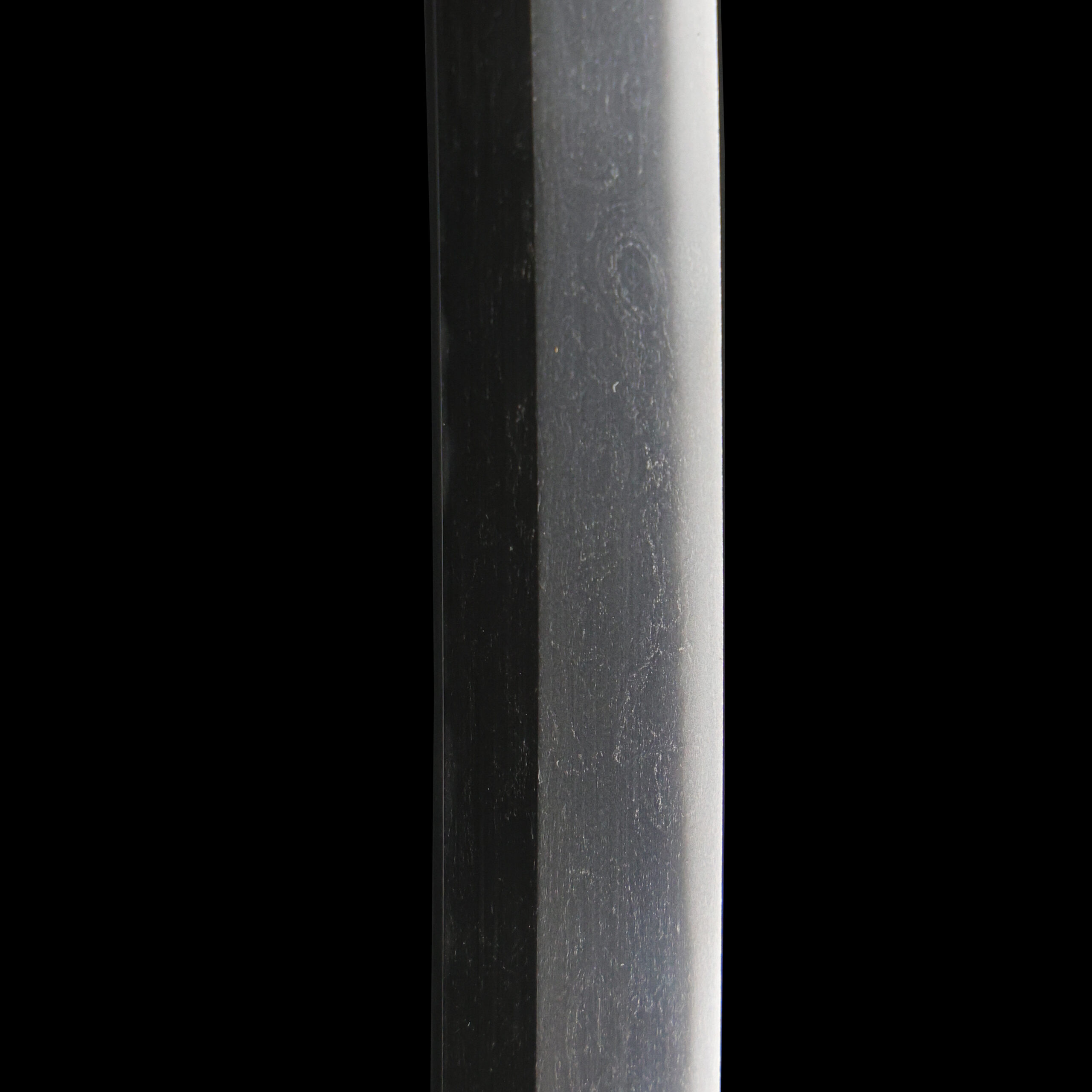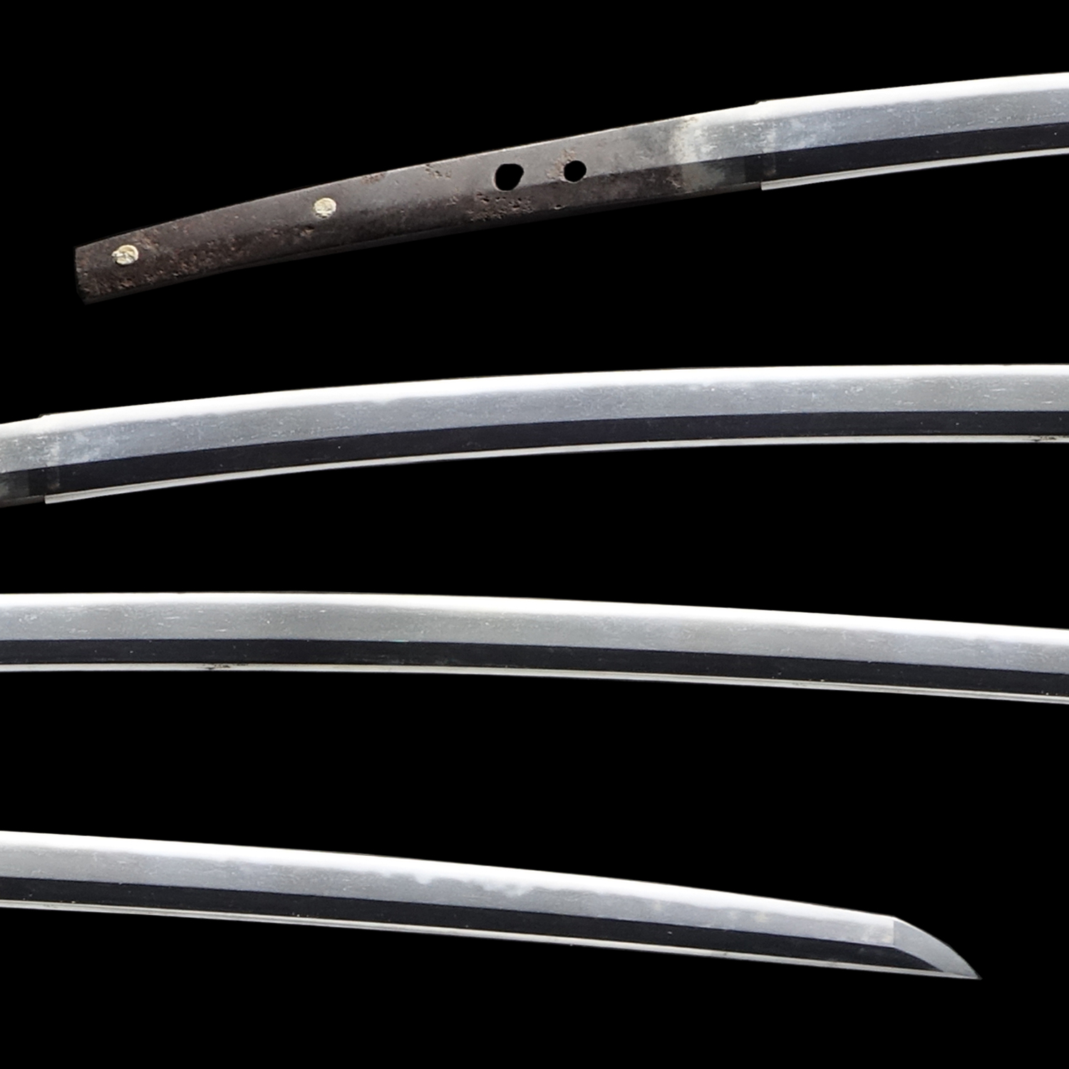 Japanese swordsmiths left the black rust on the tang because it prevents red rust while the tang is in its handle. And the discoloration of the tang was created over time, and it is a great indicator for a Japanese sword specialist to estimate when the sword was forged.