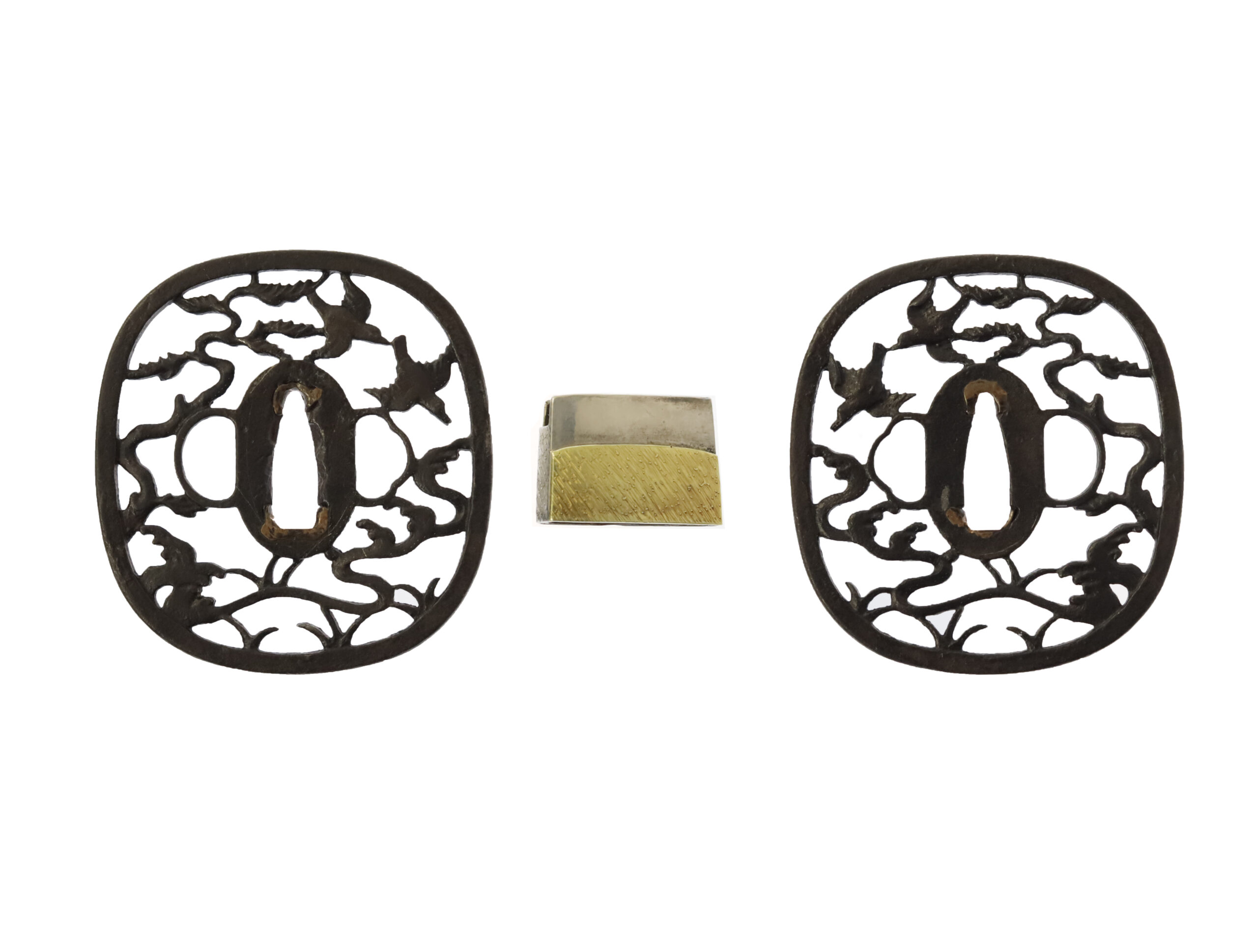 This Tsuba features an openwork (透かし彫り, sukashi-bori) design depicting a pair of birds together with pine trees. Pine trees hold deep spiritual significance in Japan. They remain green throughout the year, symbolizing eternal vitality, and are often seen as sacred trees awaiting the presence of the gods. This is why pine trees are almost always planted in Japanese gardens, serving as a prayer for the gods to dwell within them and provide protection.
