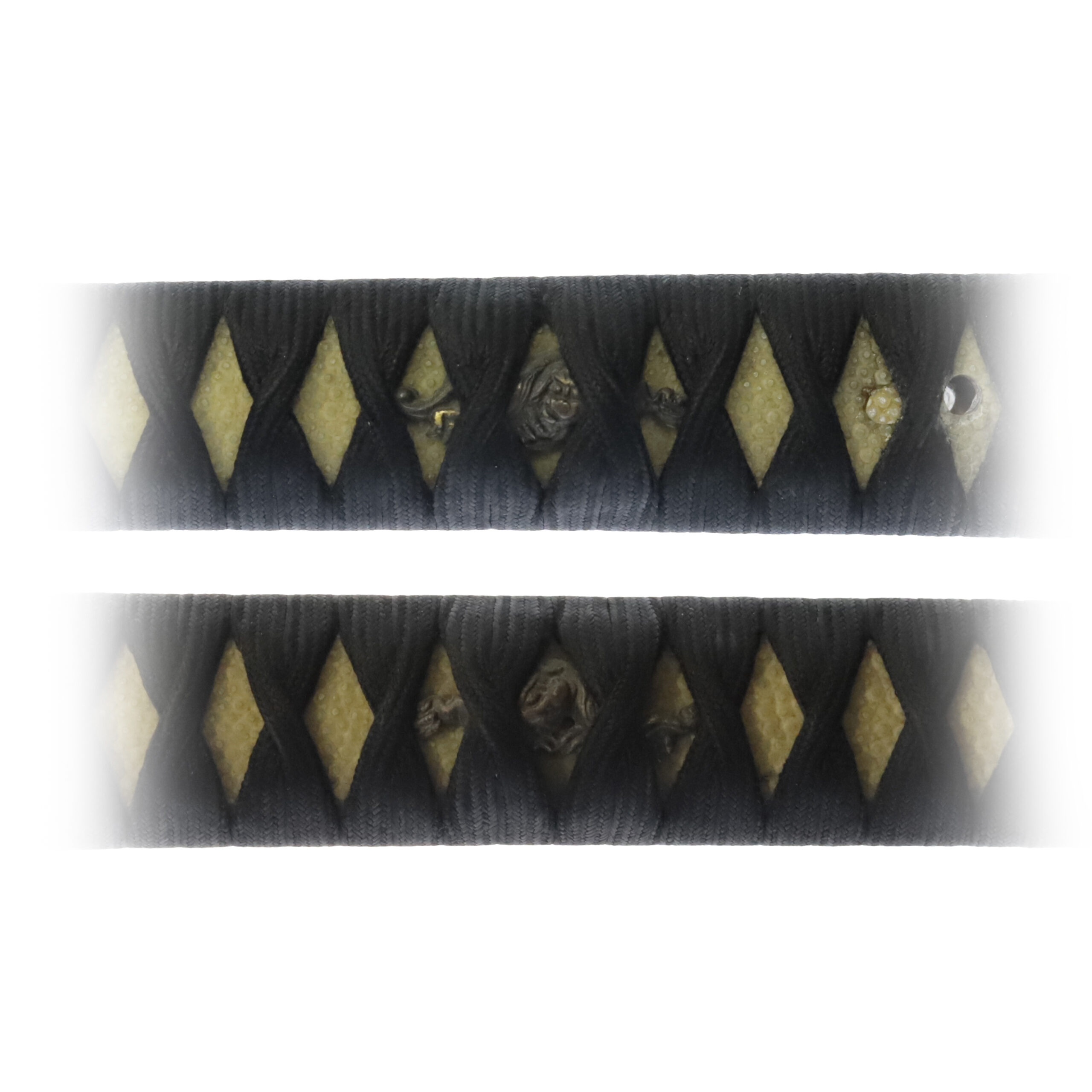 This scabbard is covered with black lacquer. Due to its high waterproof effect, lacquer has been used since ancient times in Asia. The blade of a Japanese sword is made of iron, and moisture is the greatest enemy of iron. For the purpose of carrying the blade without degrading it, people devised a method of coating the scabbard with lacquer. To prevent not only moisture but also rain and snow from penetrating the inside of the scabbard, it was necessary to apply multiple layers of lacquer. The Nushi (塗師, lacquerers) was born precisely because advanced techniques were required to handle the complicated processes.