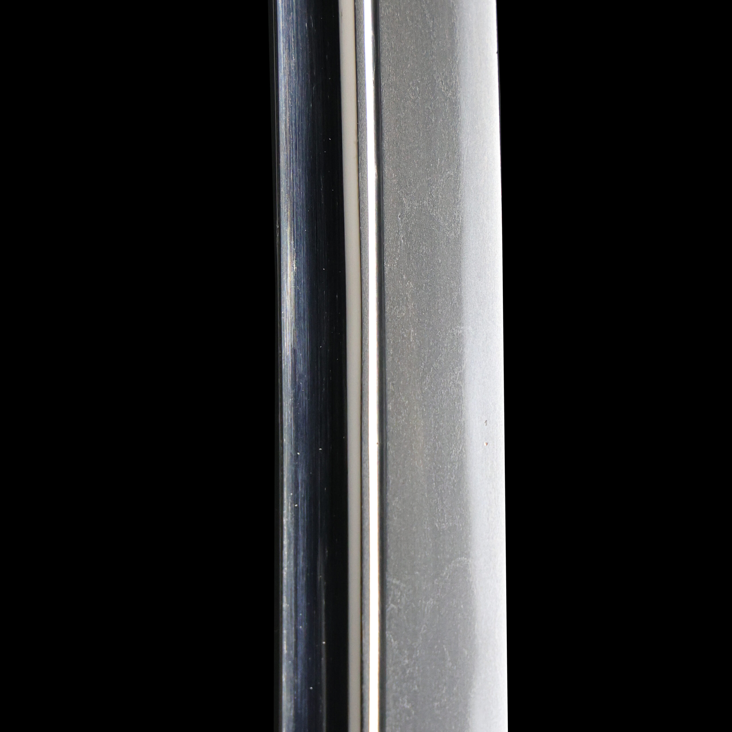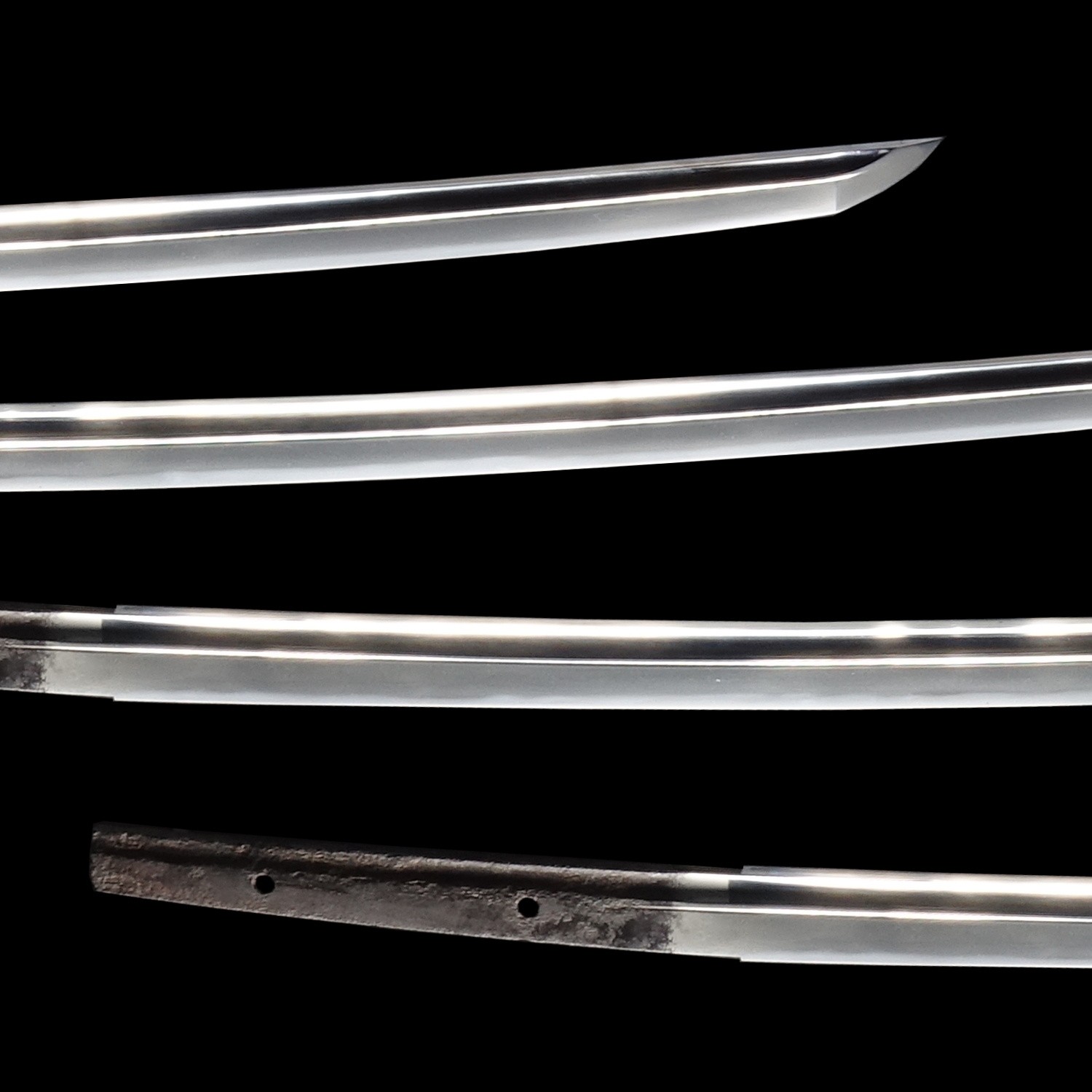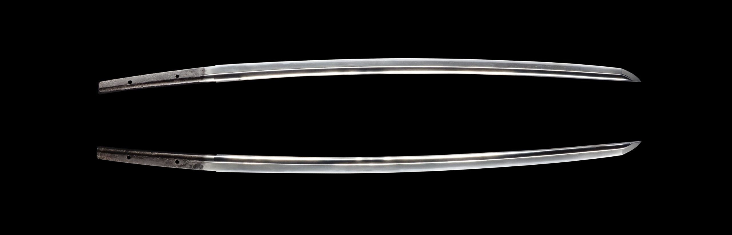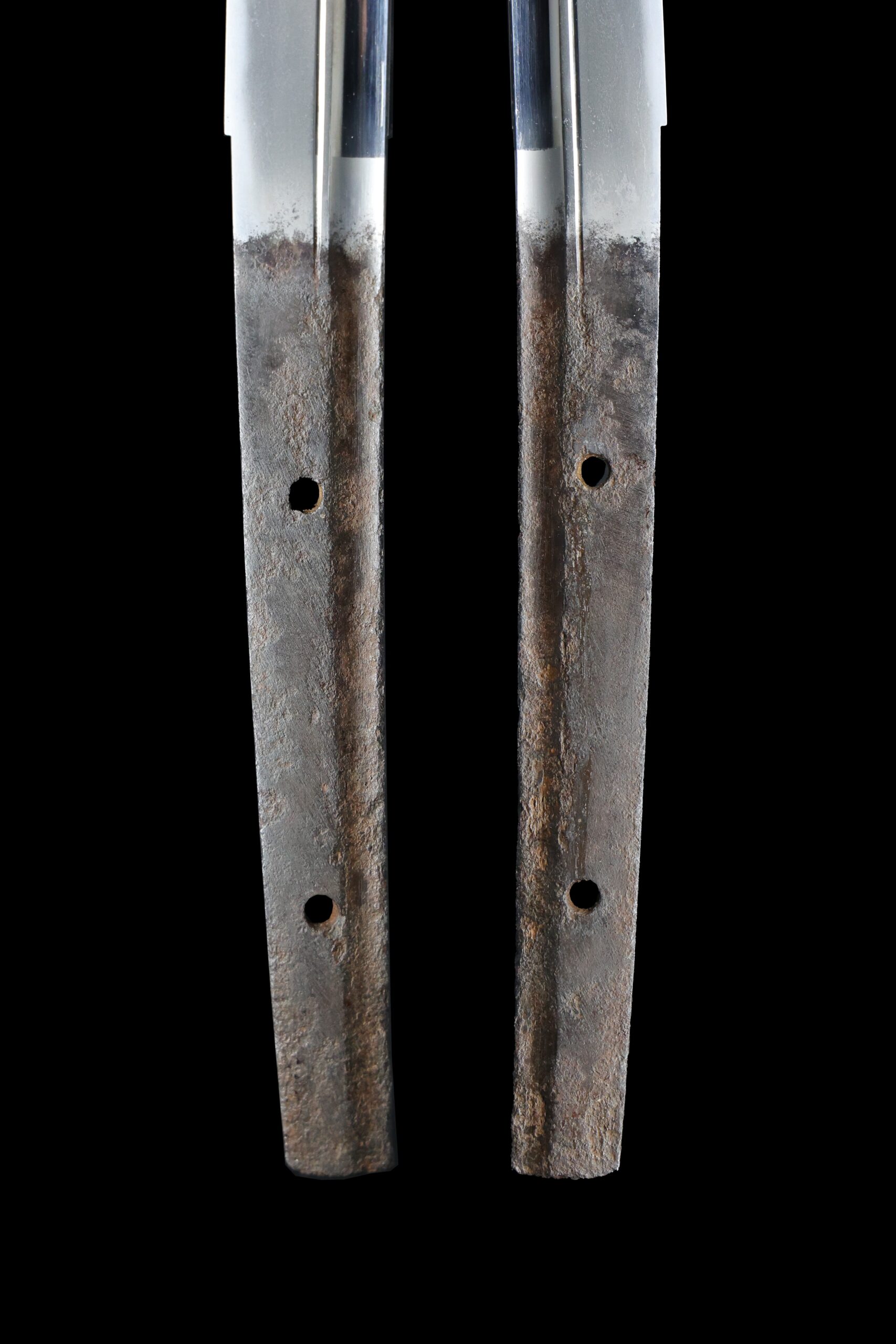 Japanese swordsmiths left the black rust on the tang because it prevents red rust while the tang is in its handle. And the discoloration of the tang was created over time, and it is a great indicator for a Japanese sword specialist to estimate when the sword was forged.