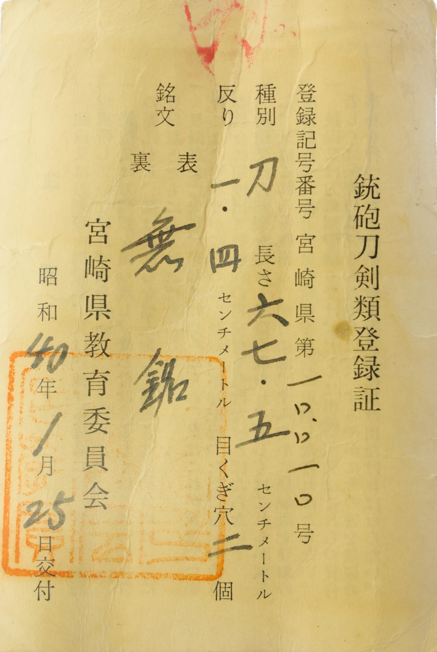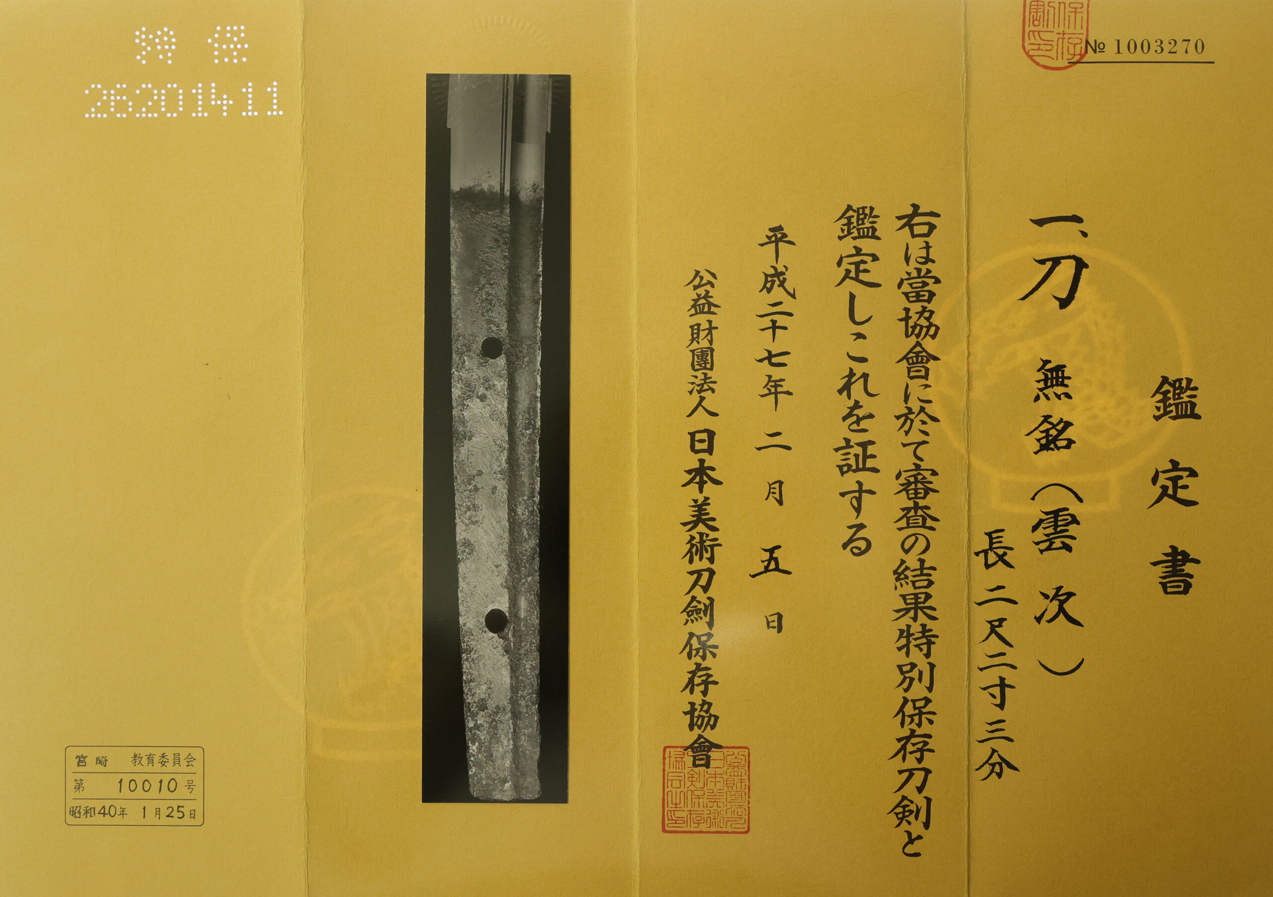 The Board of Education in Miyazaki prefecture issued a registration paper for this sword. It is called Jyu Hou Token Rui Tourokusho (銃砲刀剣類登録証). Bunkacho (The Agency for Cultural Affairs) acknowledges a Japanese sword with this paper as a work of art.