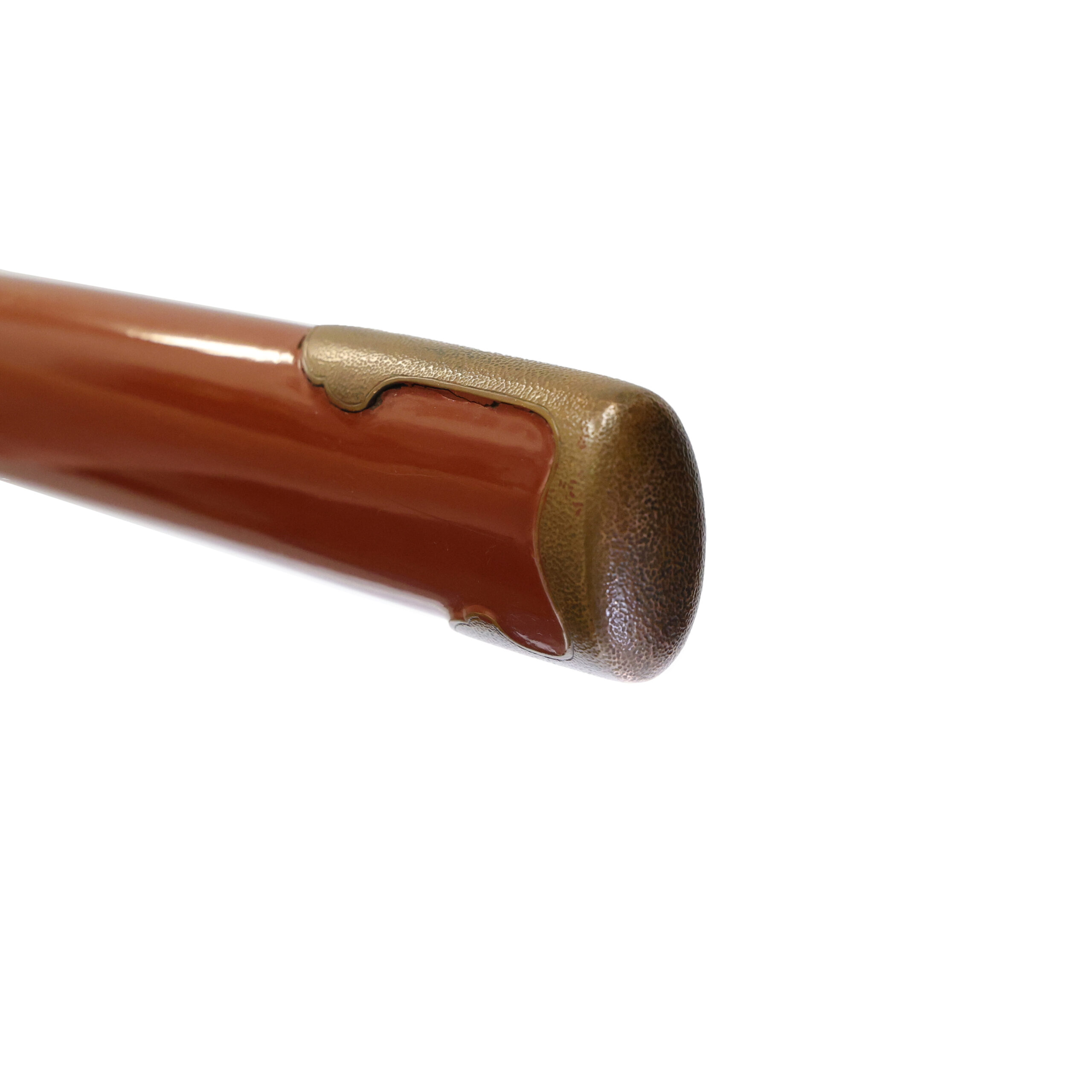 This scabbard is finished in red lacquer and fitted with a copper-colored kojiri (鐺, end cap) that has a hammered-style surface, creating a well-matching overall appearance.