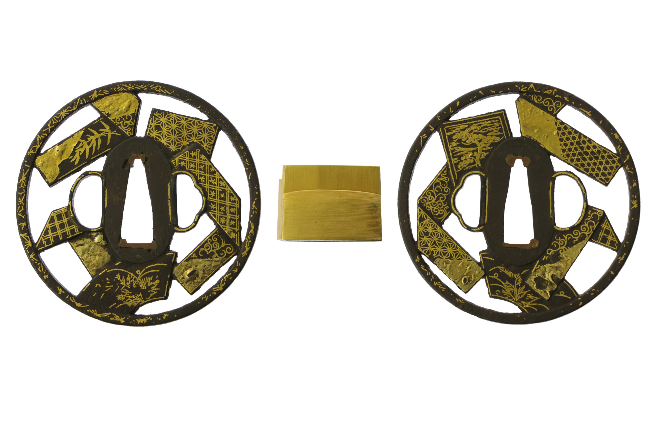 This tsuba features a design composed of geometric patterns along with a motif that seems to represent matsuba chirashi (松葉散らし, scattered pine needles). Pine needles come from an evergreen tree, and in Japanese tradition they symbolize longevity and resilience. Because the two halves of a fallen pine needle remain together, the motif is also regarded as a symbol of strong bonds and good fortune.