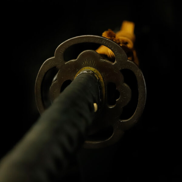 Seeing from the gaps of the Tsukamaki thread, we estimate this Menuki’s motif is maple leaves run into the water. This theme is called the Ryusui Momiji Mon (流水紅葉文). According to a theory, Momiji patterns represent longevity. Maple leaves change their colors from green to yellow, orange, or red. The fall foliage is one of the charms of autumn. Due to this behavior of the color, this design represents someone who knows how to get along in the world and be happy.
