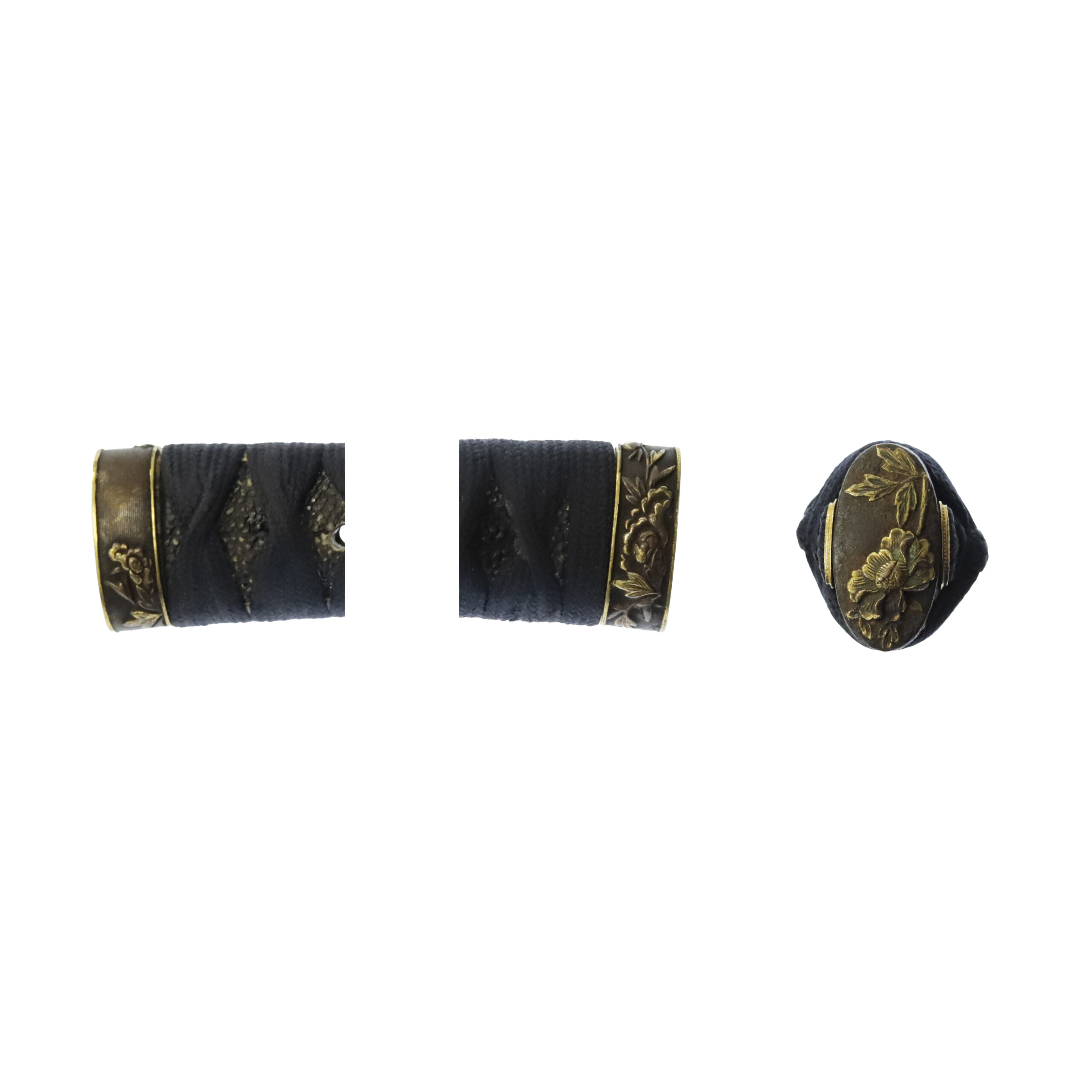 The motif of this Fuchi-Kashira is the peony (牡丹, Botan), a flower that symbolizes happiness, wealth, nobility, and elegance. In Japan, the peony has long been regarded as an auspicious motif, representing prosperity and a bountiful harvest. The second character in the Japanese word Botan (丹) originally referred to a medicinal cinnabar used by mountain hermits, believed to grant eternal youth and longevity. For this reason, the peony pattern came to symbolize everlasting vitality and refined beauty. Also, the surface of this piece features a nanakoji (魚々子地) ground—an intricate decorative technique in which countless tiny dots are evenly hammered across the metal background.