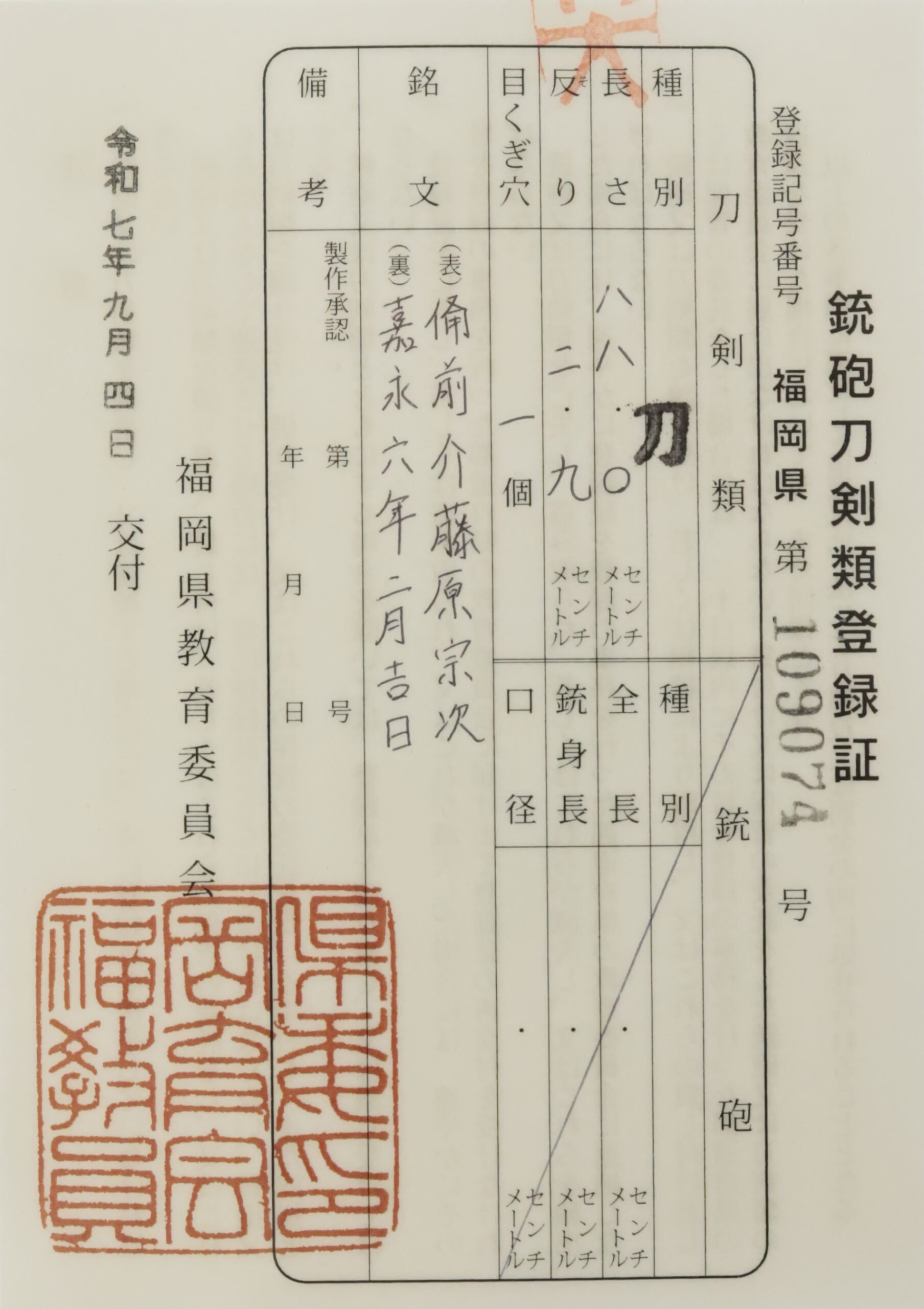 The Board of Education in Fukuoka prefecture issued a registration paper for this sword . It is called Jyu Token Rui Torokusho(銃刀剣類登録証). Bunkacho(The Agency for Cultural Affairs) acknowledges a Japanese sword with this paper as a work of art.