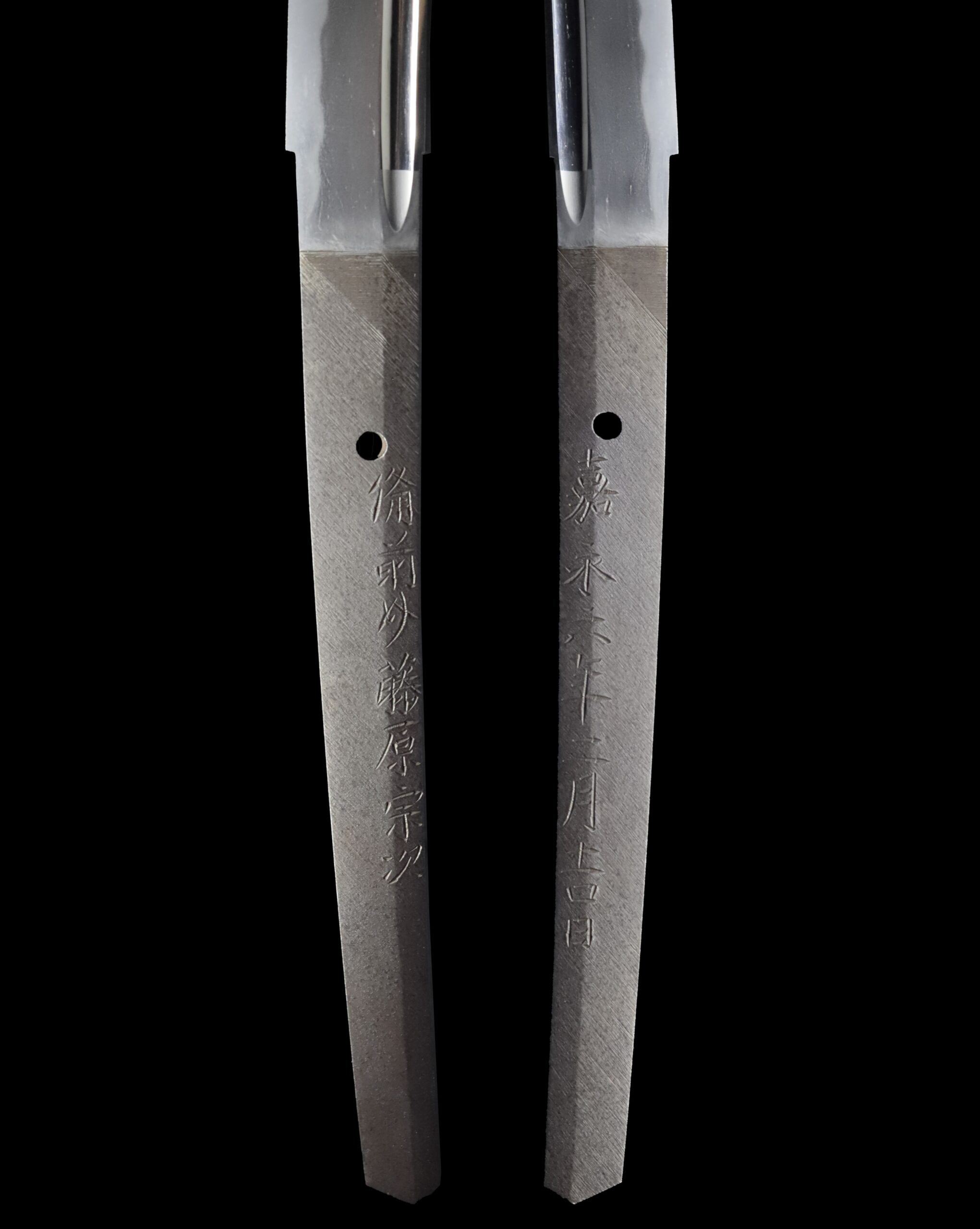 This blade is signed by Bizen no Suke Fujiwara Munetsugu (備前介藤原宗次) in the 6th year of Kaei (1853).