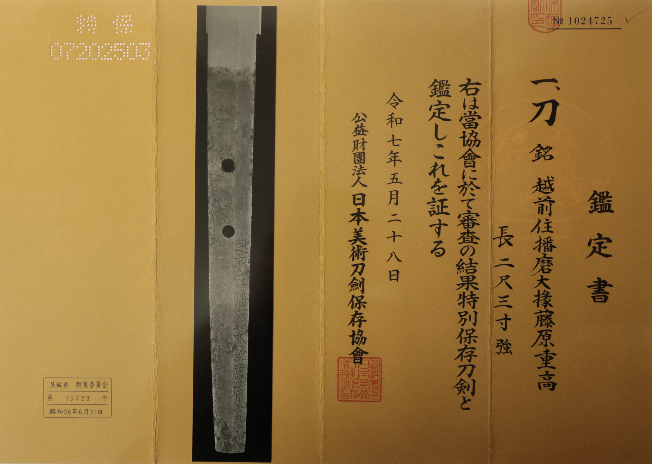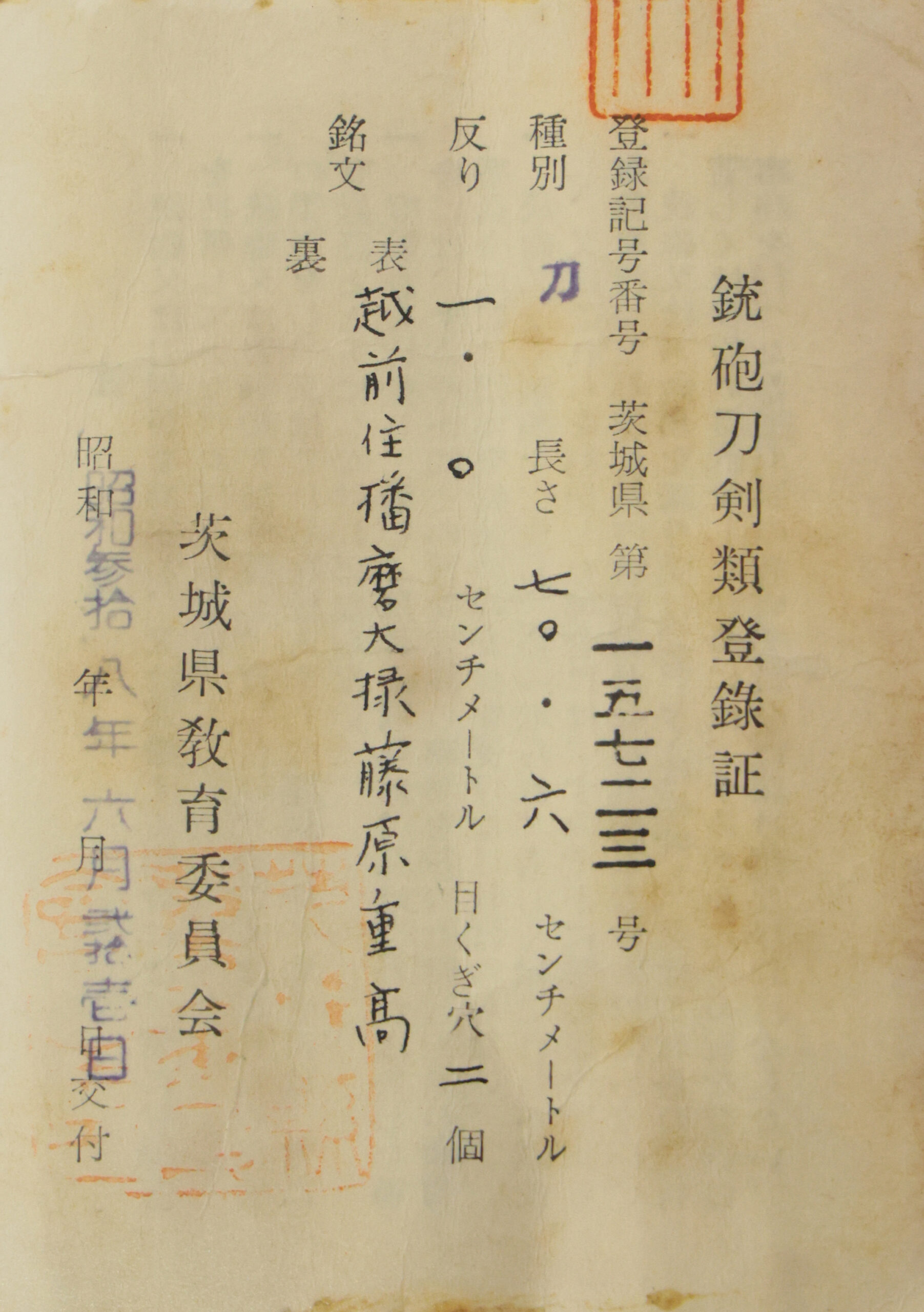The Board of Education in Ibaraki prefecture issued a registration paper for this sword. It is called Jyu Hou Token Rui Tourokusho (銃砲刀剣類登録証). Bunkacho (The Agency for Cultural Affairs) acknowledges a Japanese sword with this paper as a work of art.