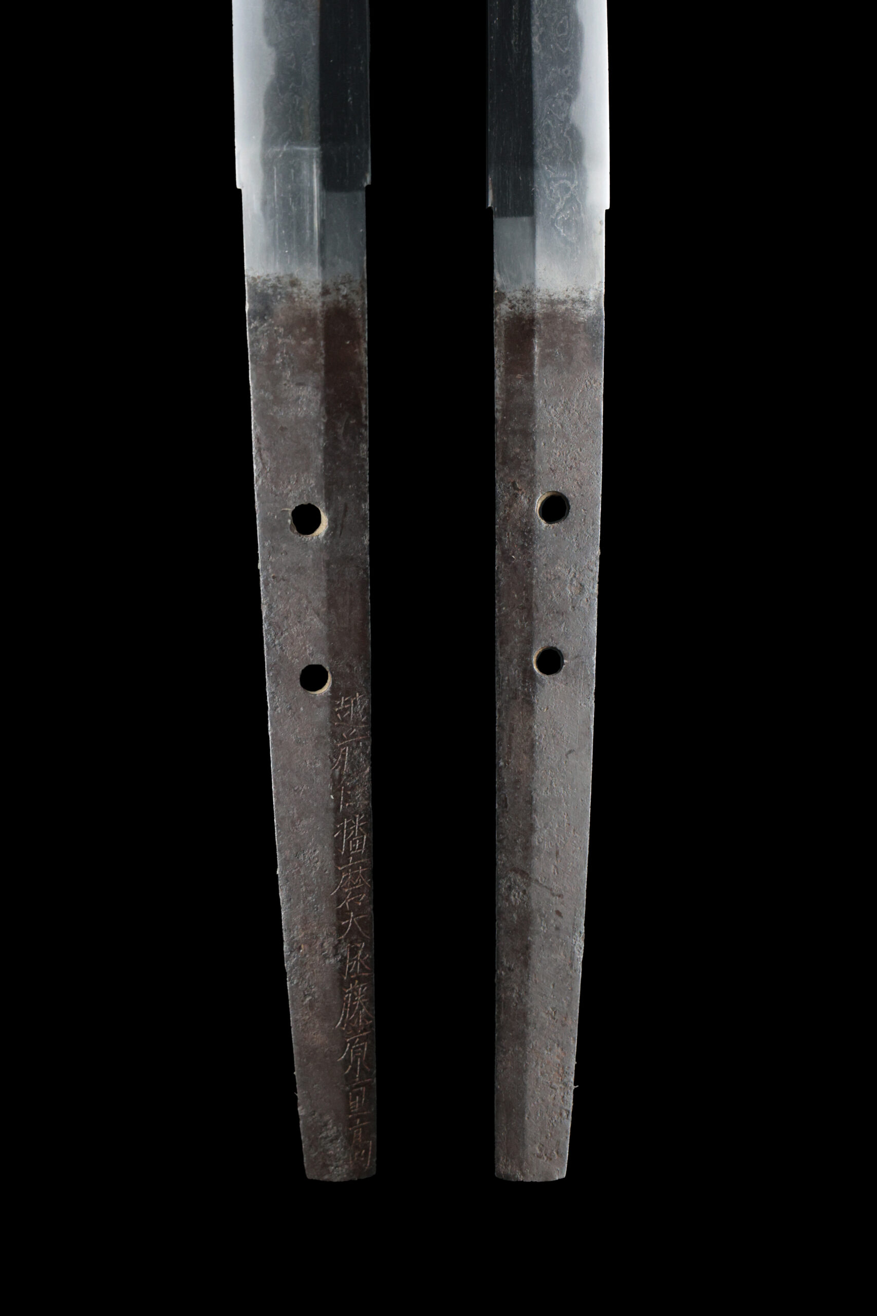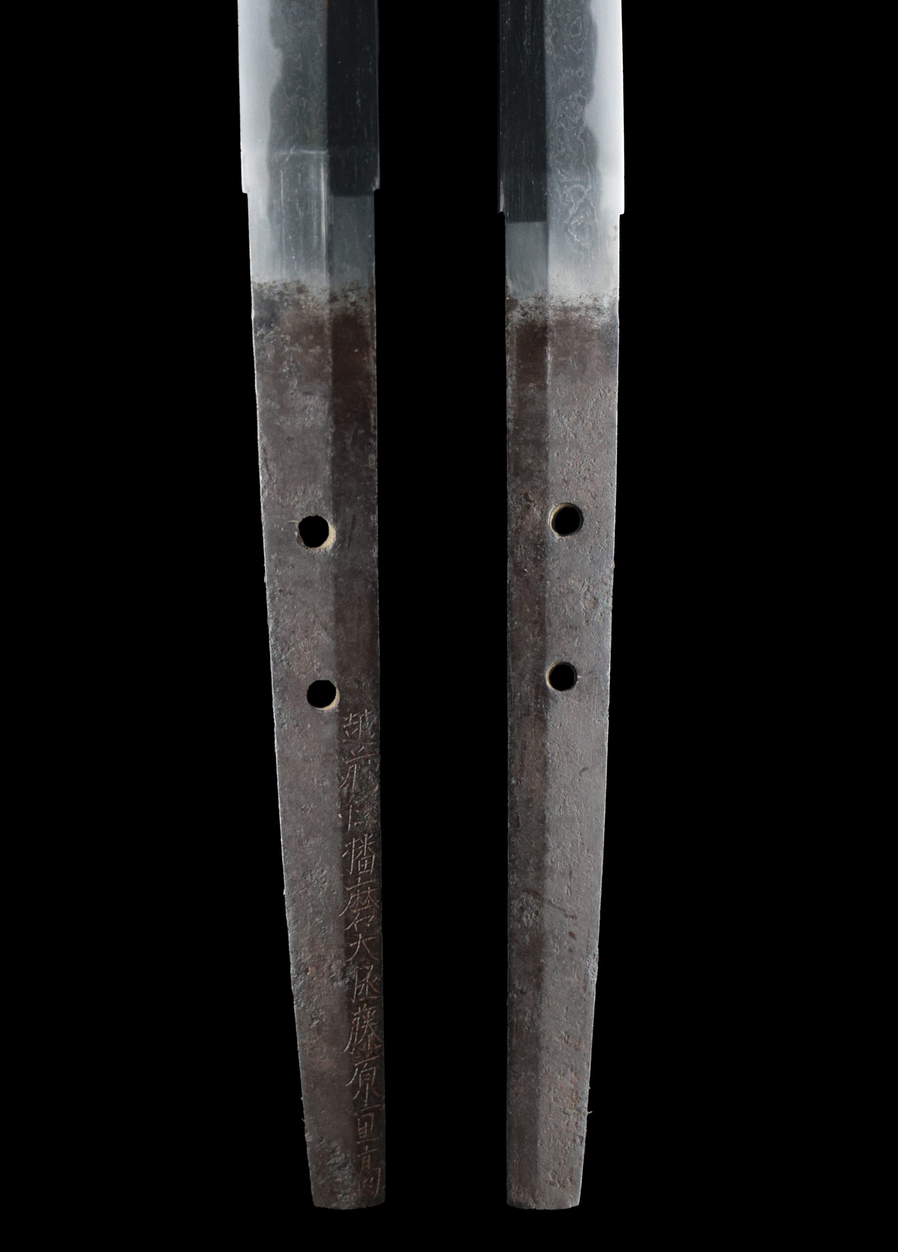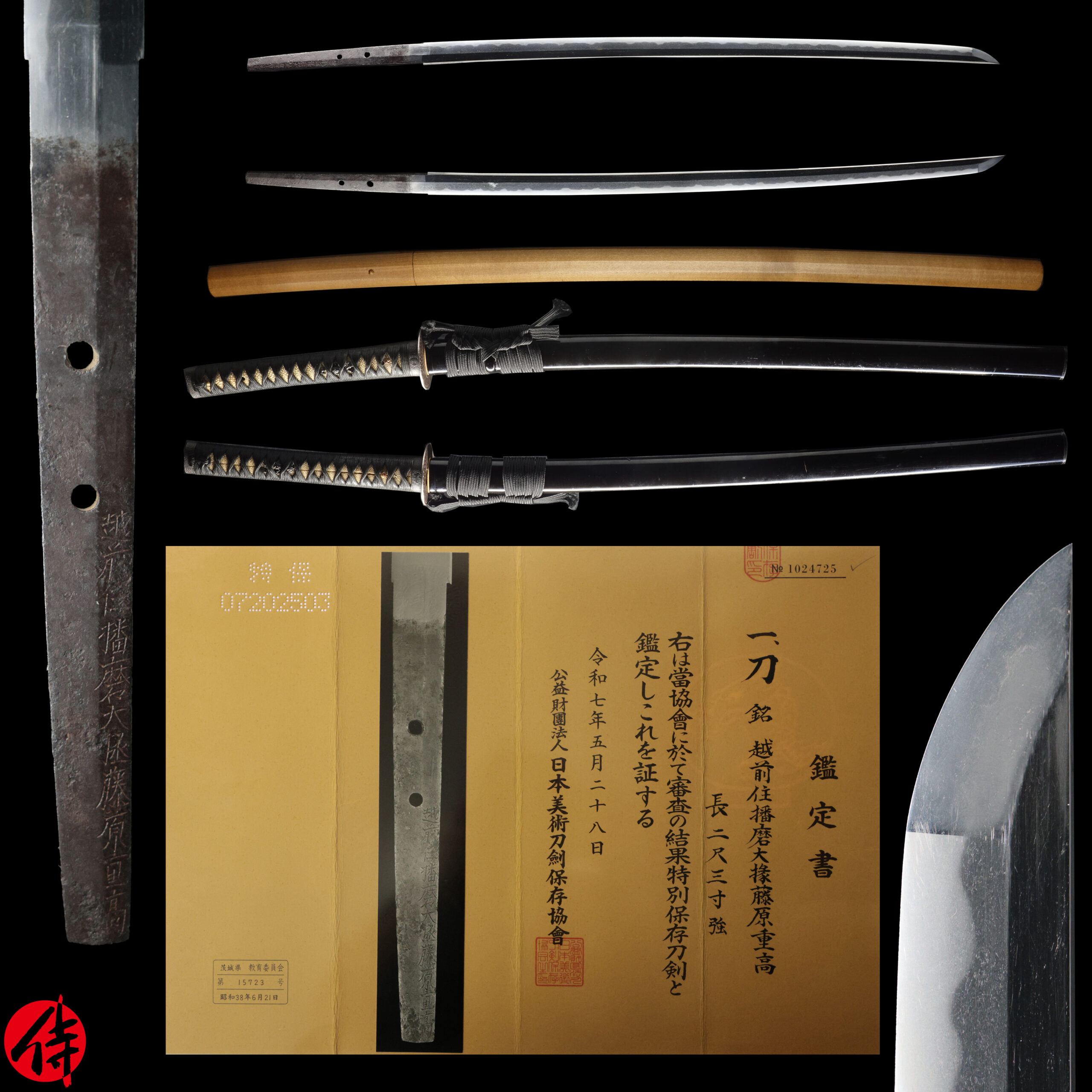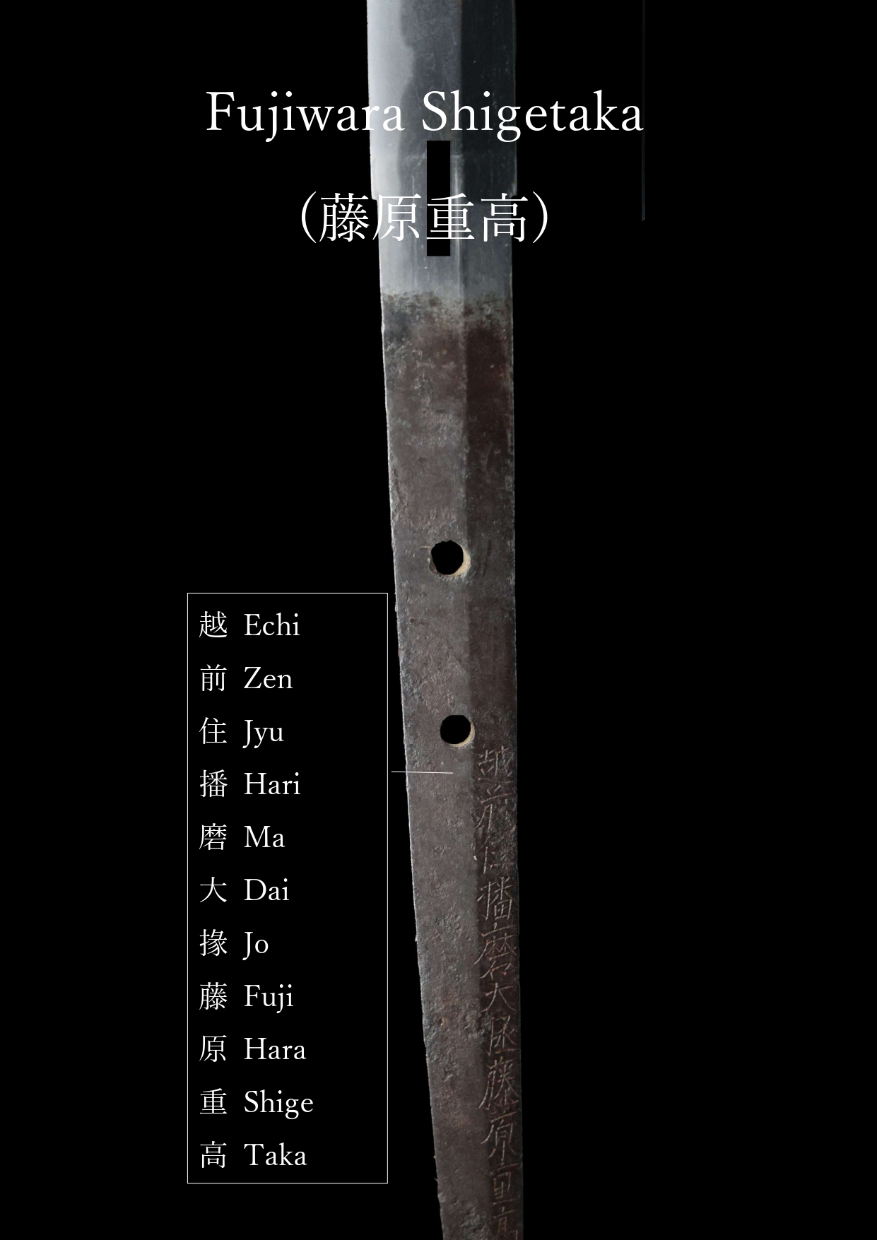 This blade was signed Echizen-jū Harima Daijō Fujiwara Shigetaka (越前住播磨大掾藤原重高).