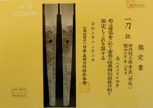 It is appraised as a Tokubetsu Hozon Token(特別保存刀剣) issued by NBTHK(Nihon Bijutsu Touken Hozon Kyokai:日本美術刀剣保存協会). This authentication paper was only given to authentic Japanese swords, especially well preserved and high quality with artistic value.