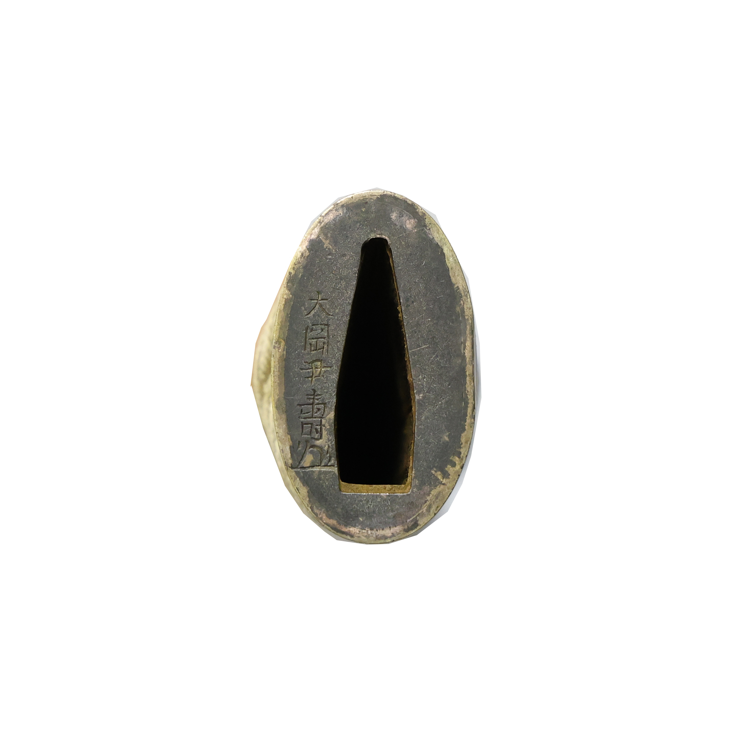 The fuchi-kashira features not only the Katabami-mon (片喰紋), as seen on the habaki, but also the Mitsu Kashiwa (三つ柏) family crest, which depicts three broad oak leaves. In ancient Japan, oak leaves were commonly used as natural vessels for serving food and offerings, making them an essential part of daily life. This close relationship with food and nature also extended into the realm of faith. Early Japanese religions, rooted in everyday life, worshiped natural elements such as the sun, mountains, rivers, and oceans. Offerings were made to these sacred objects, and oak leaves, along with other plant leaves, were used as containers for these offerings.