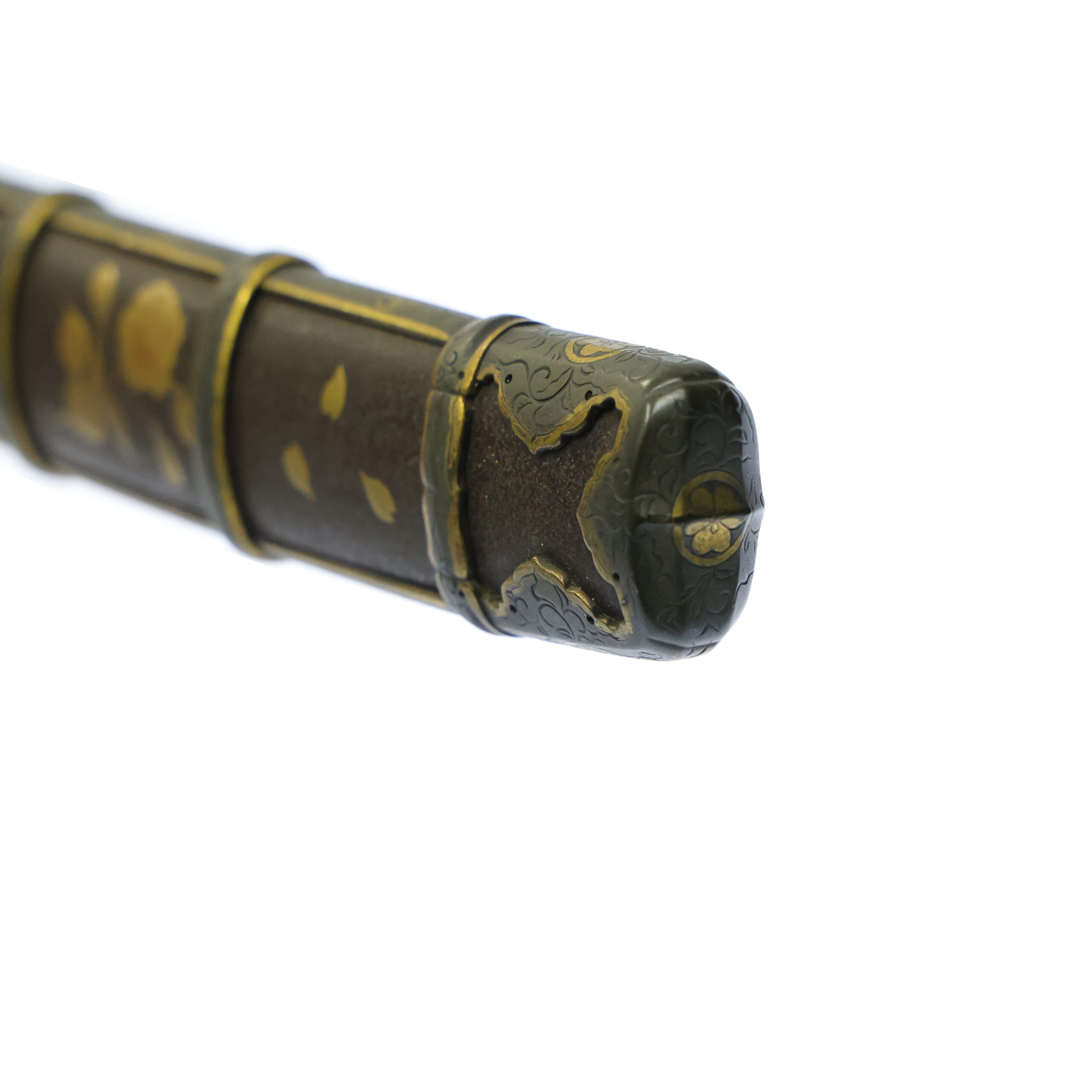 The saya is beautifully decorated with a scattered cherry blossom motif, rendered in the maki-e (蒔絵) technique. Cherry blossoms hold deep cultural significance in Japan, symbolizing the beauty of fleeting moments and the changing of the seasons. Because the blossoms bloom brilliantly yet fall quickly, they have long been associated with impermanence and renewal, making them a favored motif in Japanese decorative arts and sword mountings.