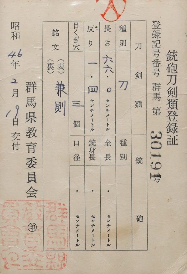 The Board of Education in Gunma prefecture issued a registration paper for this sword . In order to obtain this paper, the sword needs to be traditionally hand forged. With this paper, its owner can legally own an authentic Japanese sword in Japan. This paper will need to be returned to the board of education when the sword being shipped abroad but you can receive a copy of it.