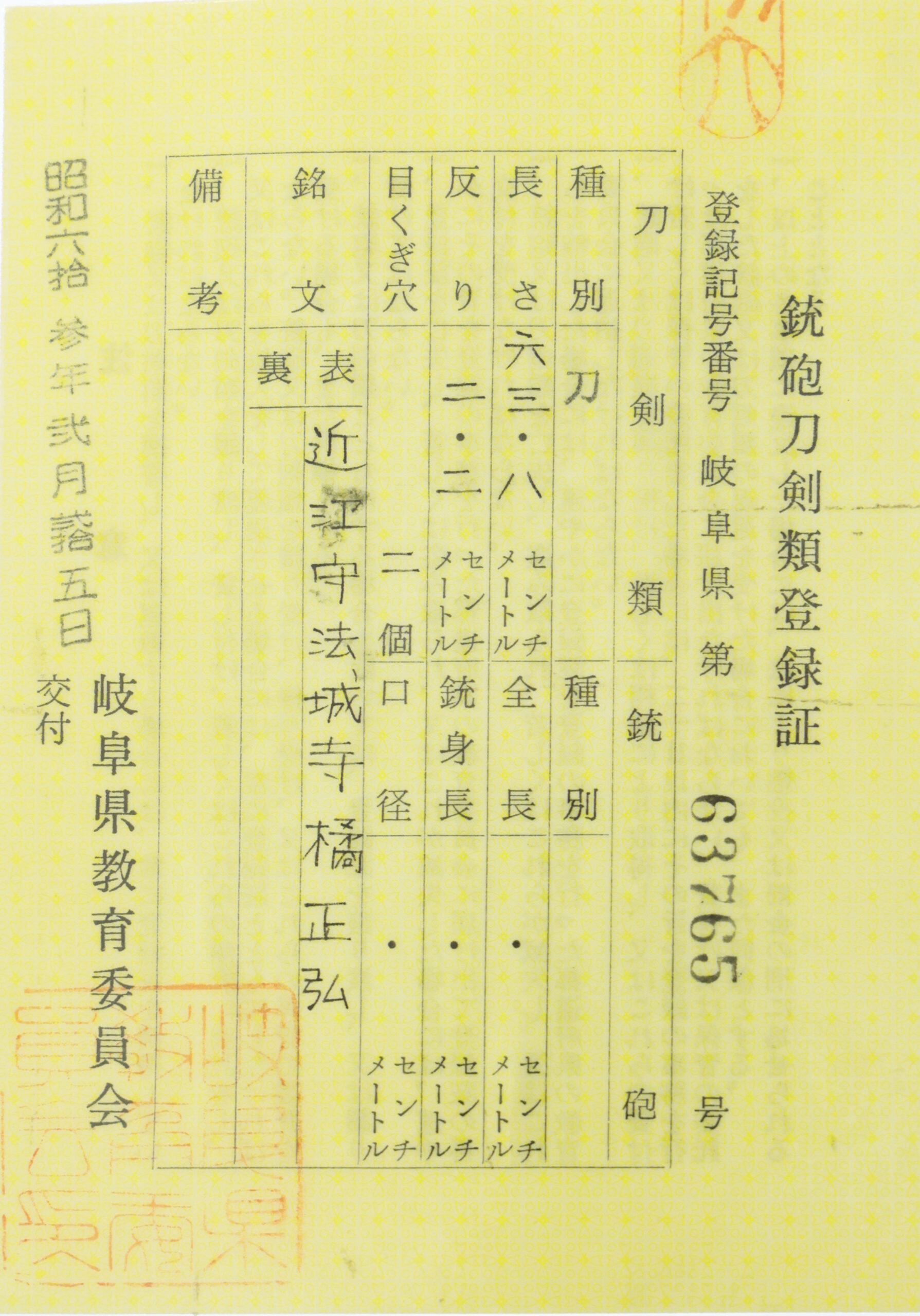 The Board of Education in Gifu predecture issued a registration paper for this sword. It is called Jyu Hou Token Rui Tourokusho (銃砲刀剣類登録証). Bunkacho (The Agency for Cultural Affairs) acknowledges a Japanese sword with this paper as a work of art.