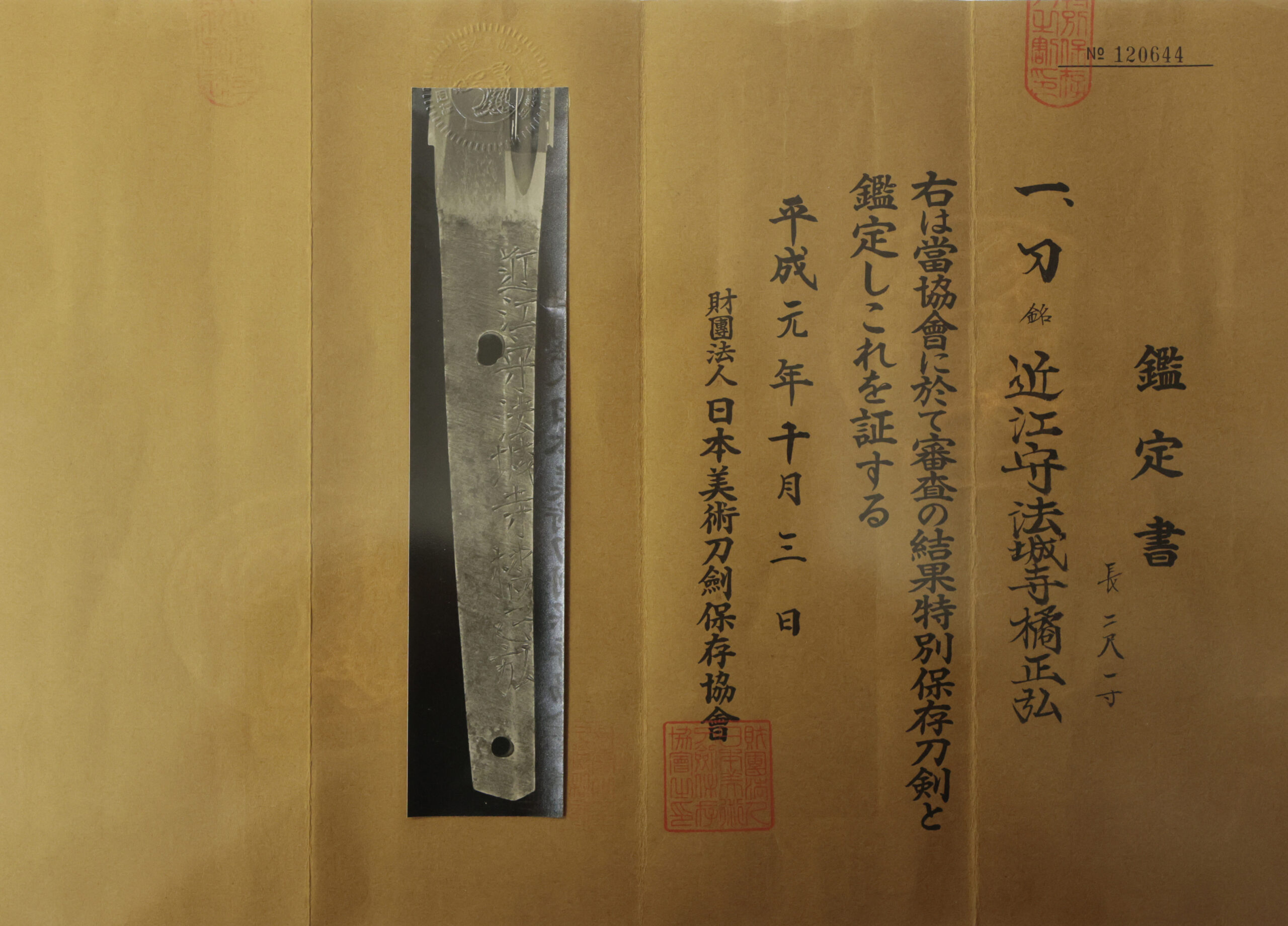 It is appraised as a Tokubetsu Hozon Token (特別保存刀剣) issued by NBTHK (Nihon Bijutsu Touken Hozon Kyokai:日本美術刀剣保存協会). This authentication paper was only given to authentic Japanese swords, especially well preserved and high quality with artistic value.