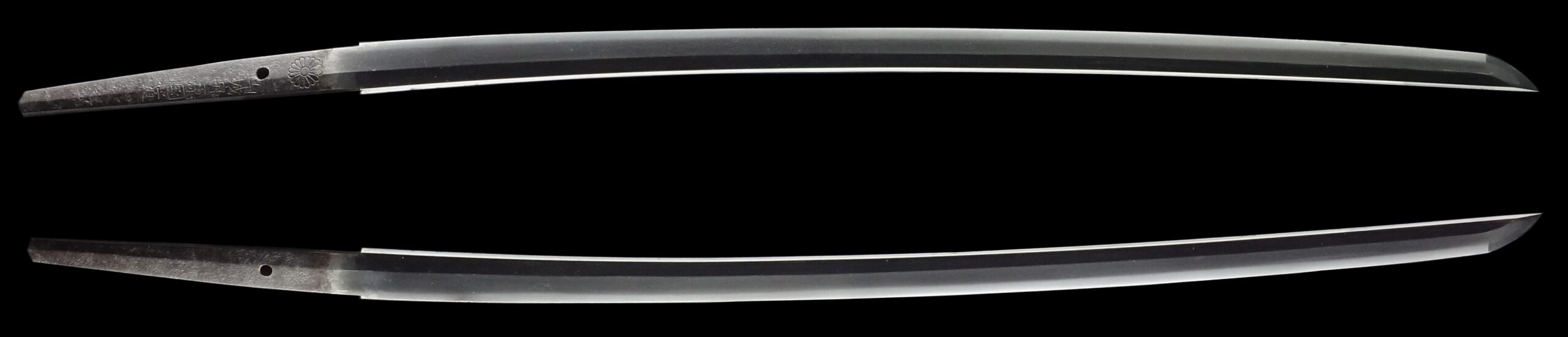 He was allowed to inscribe a chrysanthemum emblem, which is the symbol of the Japanese emperor. His sword-forging technique was so great that the emperor permitted him to use this emblem, which was honorable for any swordsmith. A chrysanthemum emblem remains in the tang of this blade.