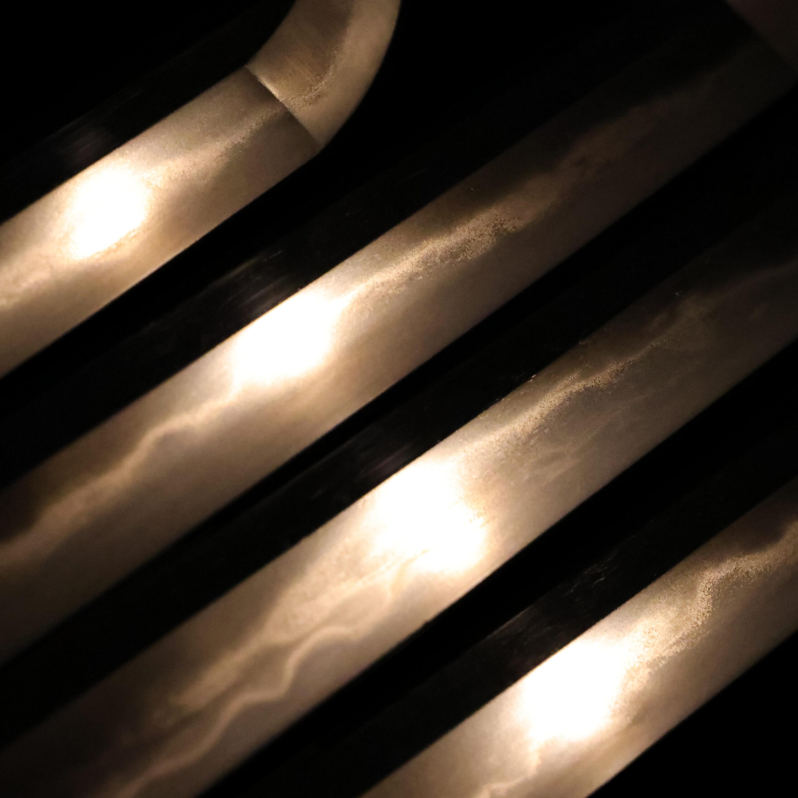 This scabbard is covered with black lacquer. Due to its high waterproof effect, lacquer has been used since ancient times in Asia. The blade of a Japanese sword is made of iron, and moisture is the greatest enemy of iron. For the purpose of carrying the blade without degrading it, people devised a method of coating the scabbard with lacquer. To prevent not only moisture but also rain and snow from penetrating the inside of the scabbard, it was necessary to apply multiple layers of lacquer. The Nushi (塗師, lacquerers) was born precisely because advanced techniques were required to handle the complicated processes.