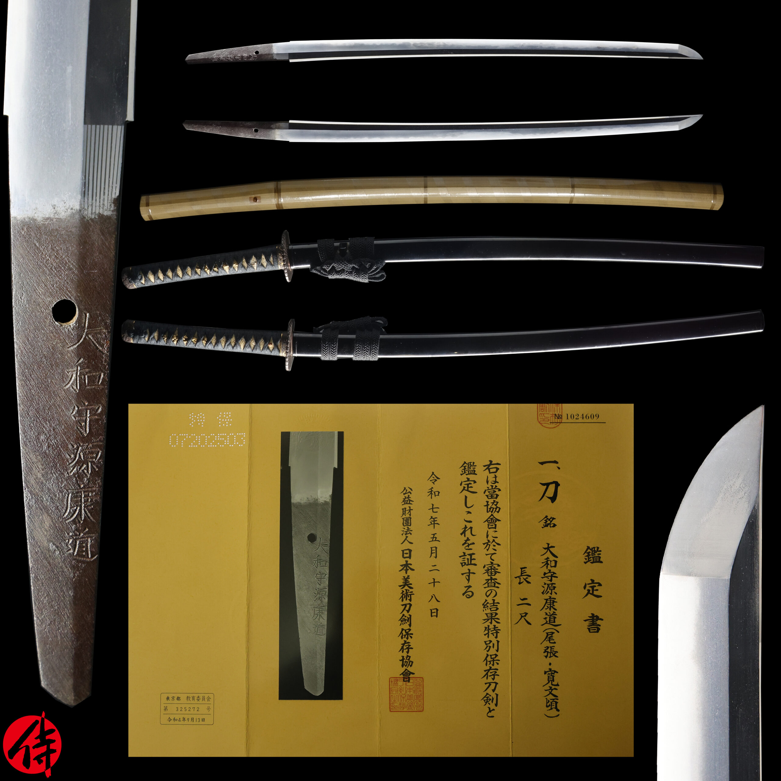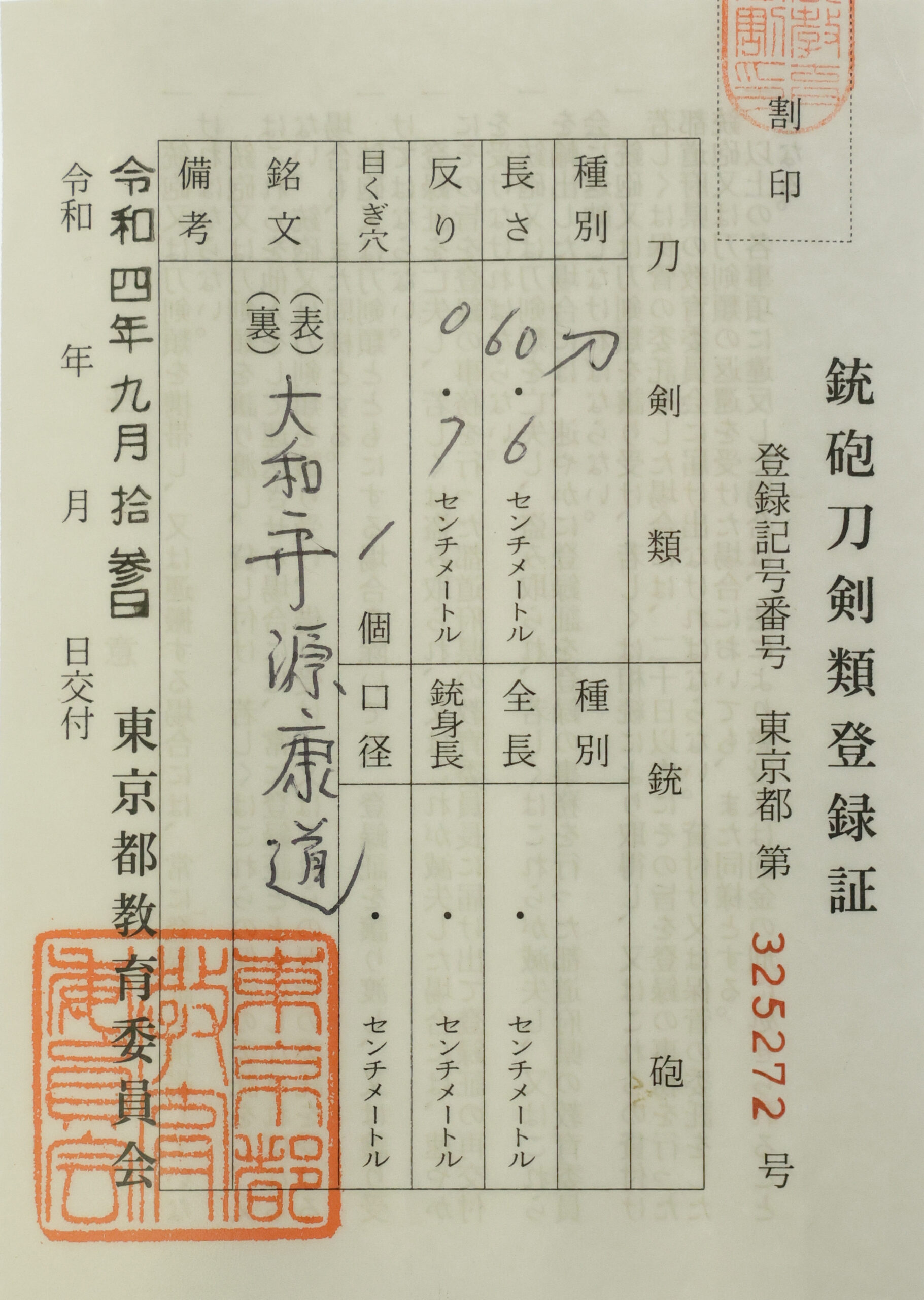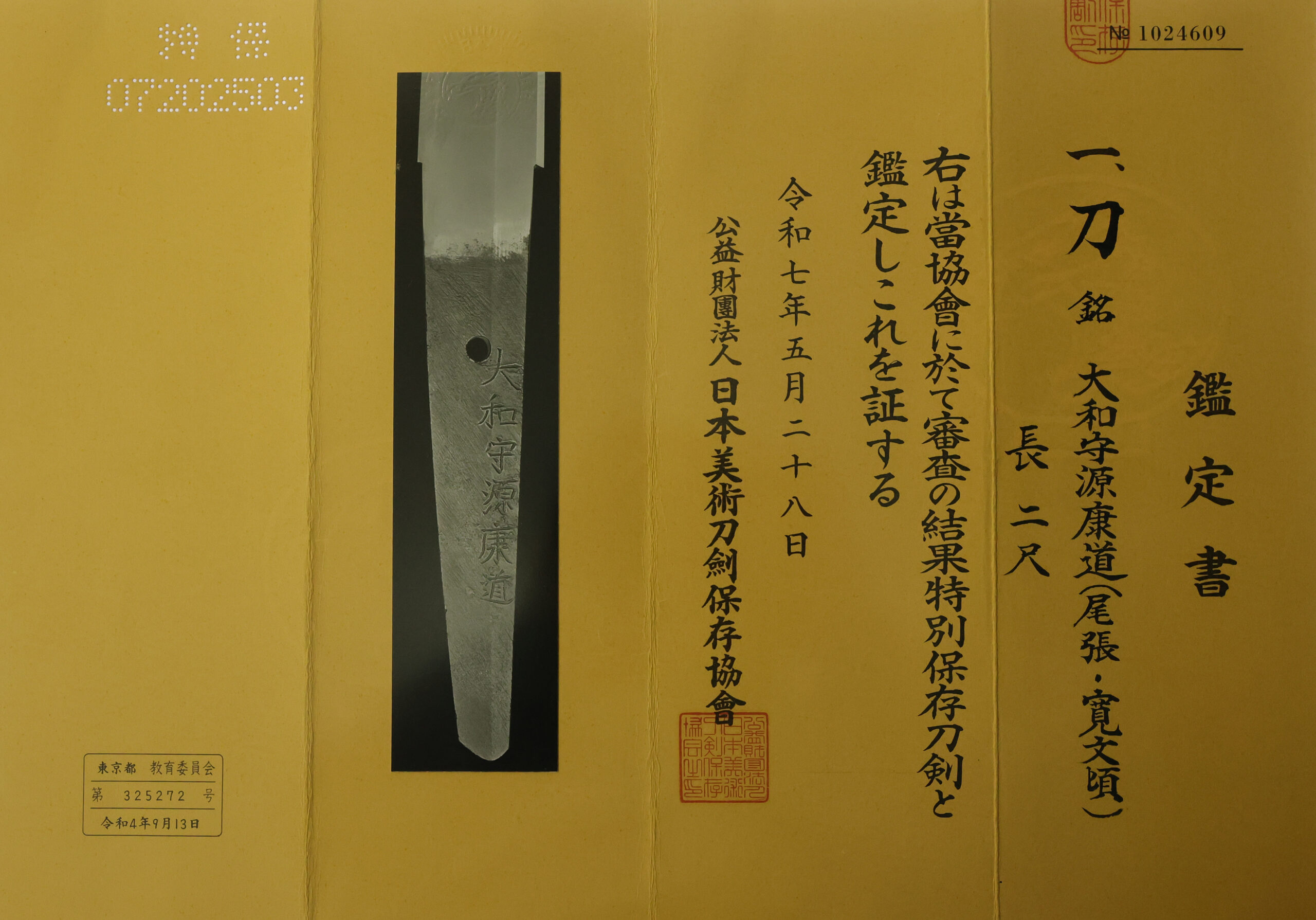 The Board of Education in Tokyo issued a registration paper for this sword. It is called Jyu Hou Token Rui Tourokusho (銃砲刀剣類登録証). Bunkacho (The Agency for Cultural Affairs) acknowledges a Japanese sword with this paper as a work of art.