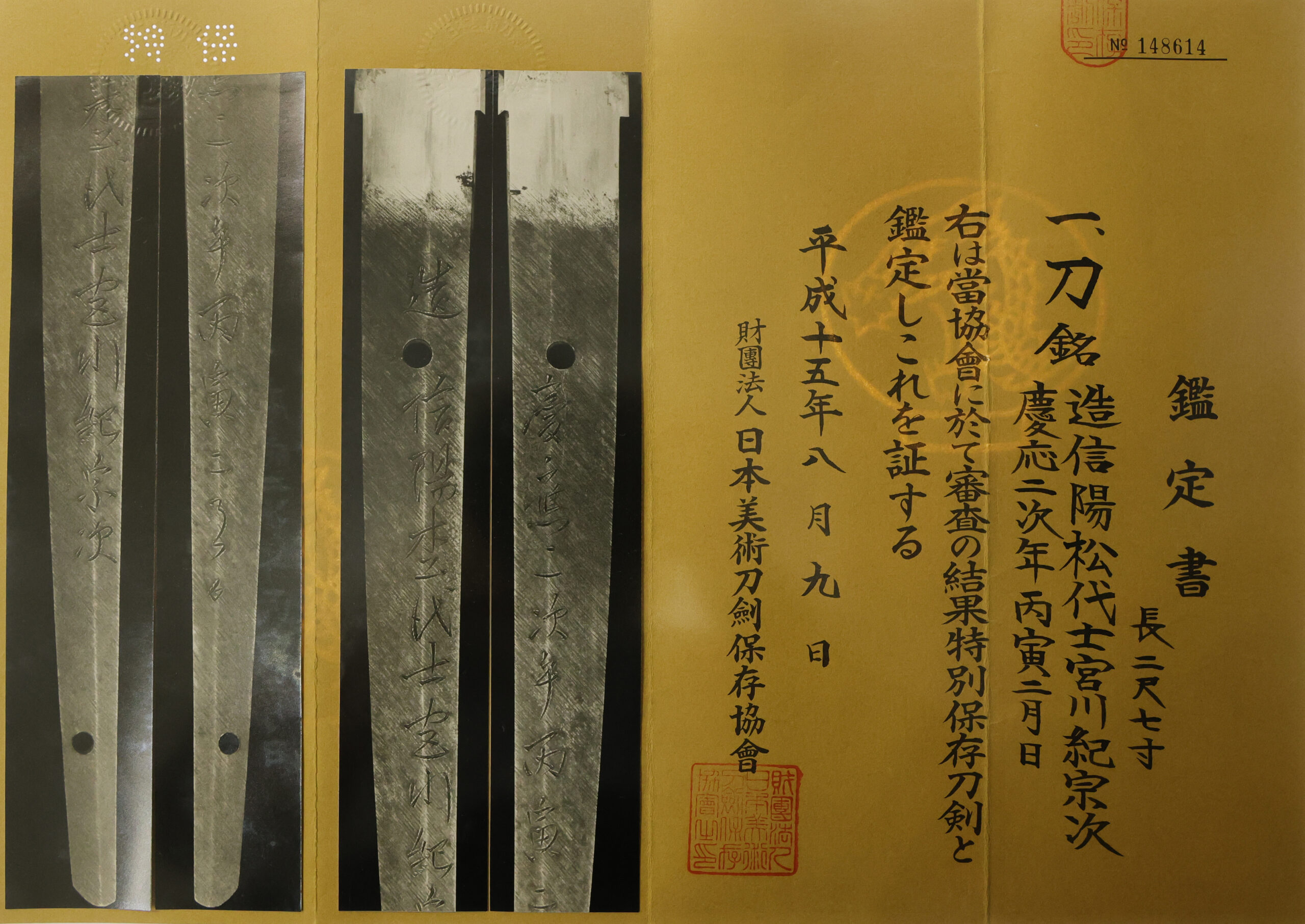 Authentication PaperNBTHK TOKUBETSU Hozon Certificate for the blade (No. 148614)