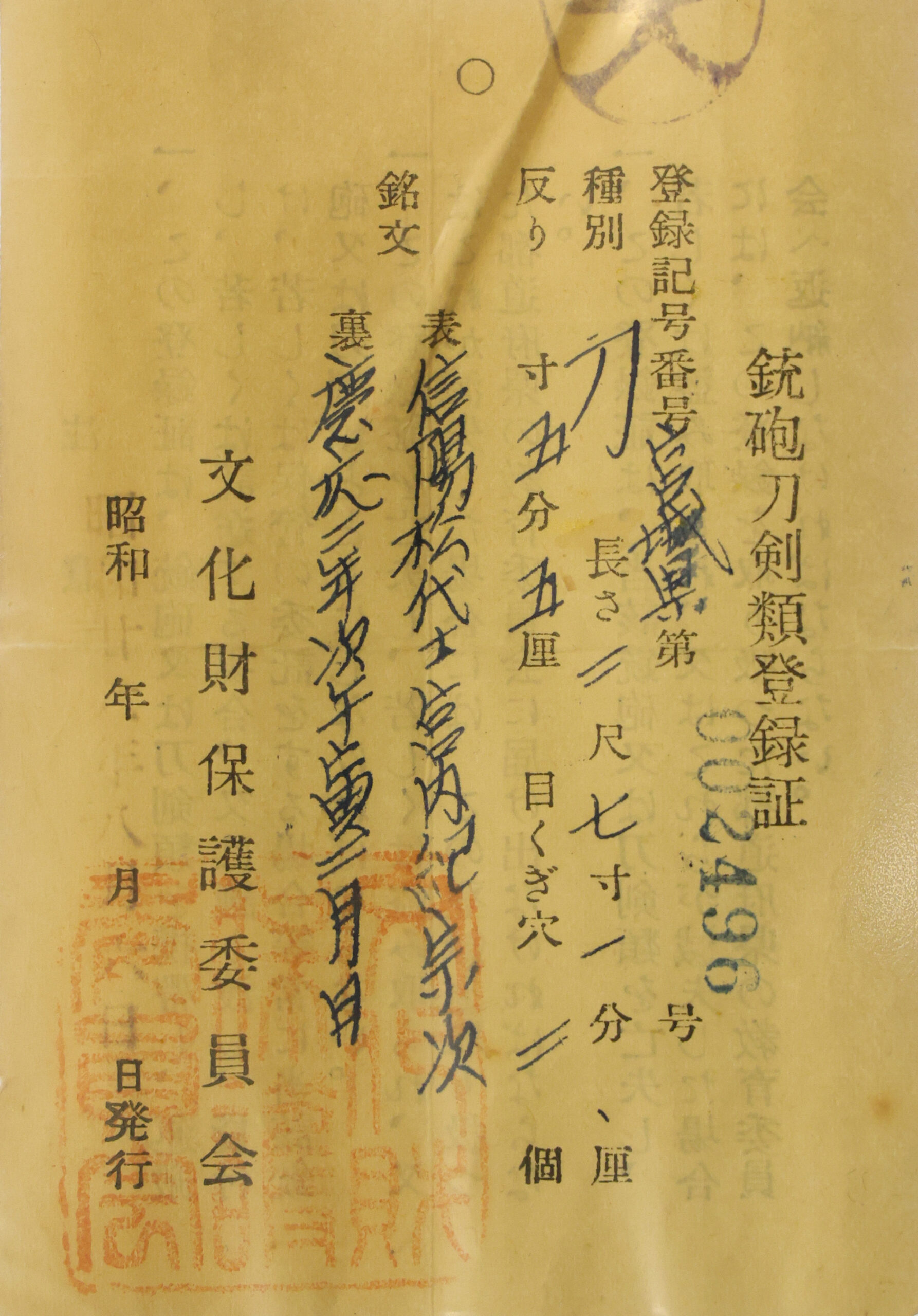 The Board of Education in Miyagi prefecture issued a registration paper for this sword. It is called Jyu Hou Token Rui Tourokusho (銃砲刀剣類登録証). Bunkacho (The Agency for Cultural Affairs) acknowledges a Japanese sword with this paper as a work of art.