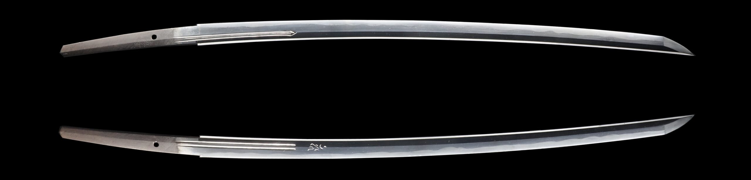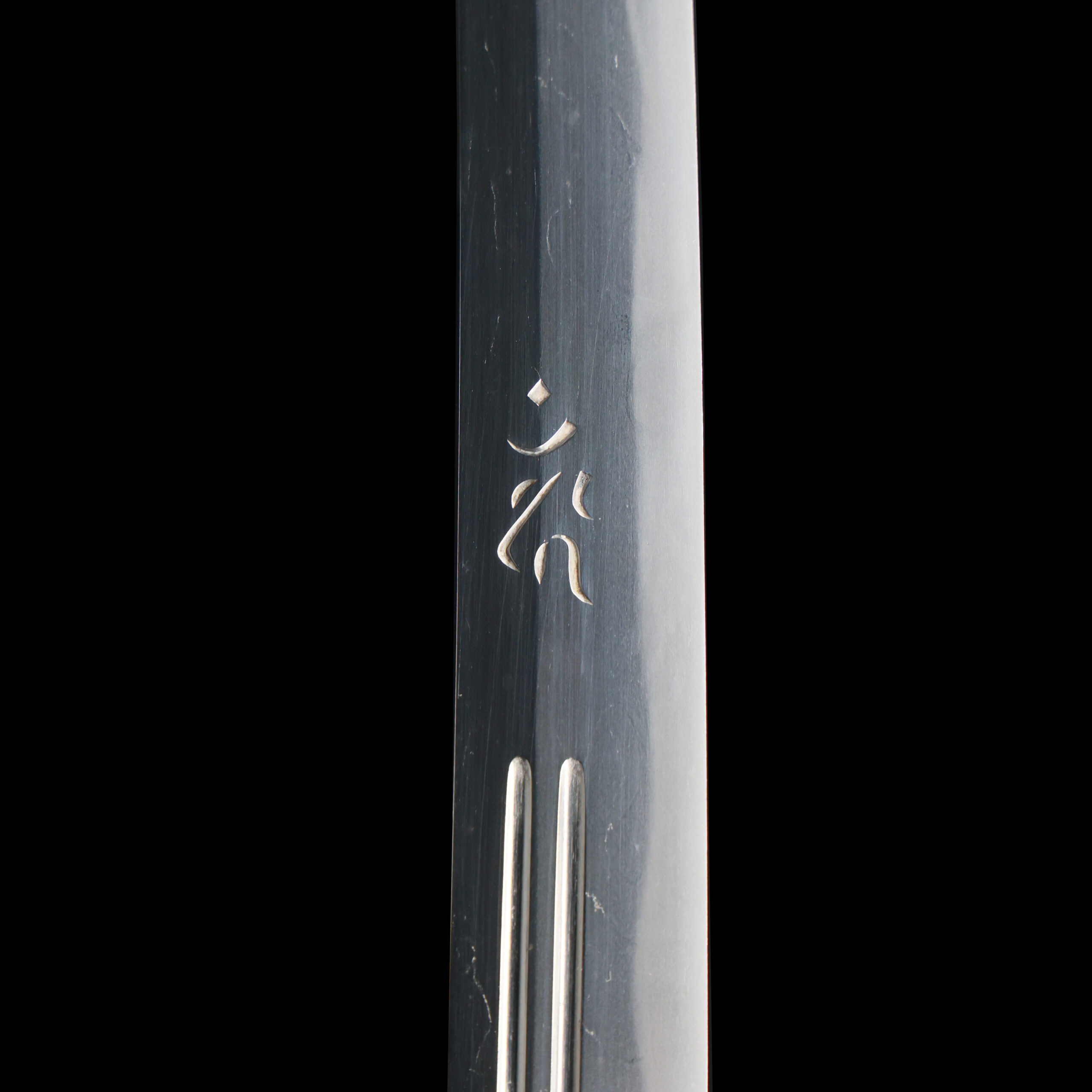A Bonji character is carved in to this blade. Bonji are Sanskrit seed syllables that represent Buddhist deities and serve as sacred symbols for invoking divine protection. Among them, the character “Kān” (カーン) symbolizes Fudō Myō-ō, one of the most revered guardian deities among samurai warriors. Another Sanskrit character, “Kanmān” (カンマーン), combines with “Man” to form a sacred mantra. During the age of the samurai, warriors often incorporated such religious motifs into their armor, helmets, and swords as expressions of faith and spiritual strength in battle.